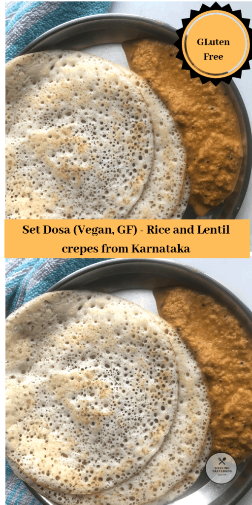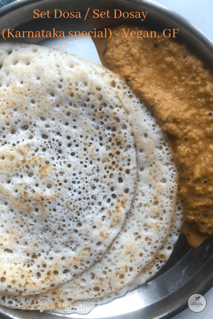 Set Dosa is a soft, airy and porous Dosa (savoury V + GF Crepe) made with Rice, lentils. It is served in a set of 2 or 3 along with any curry or chutney.