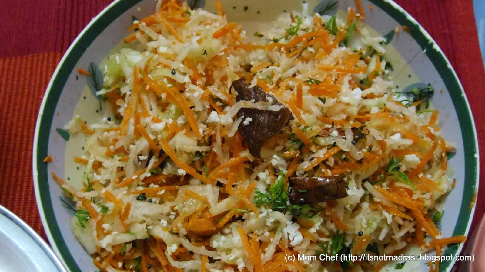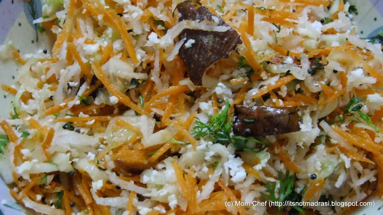 Kosambari (Kannada)/Koshimir (Marathi)/Kosumalli (Tamil) is the 'salad' equivalent, well, in the South of Vindhyas. Served in soaked-dal-and-tempered or mixed-raw-veggies version, this dish is a also a stand alone option for a quick lunch/brunch fix, if one is indisposed or lazy to cook on a particular day. Bursting with vitamins and the goodness of freshly grated veggies, the Carrot Kosimbiri I made today had grated raddish too - great for the heart, a dash of lime and coconut and was super quick to make and healthy too.