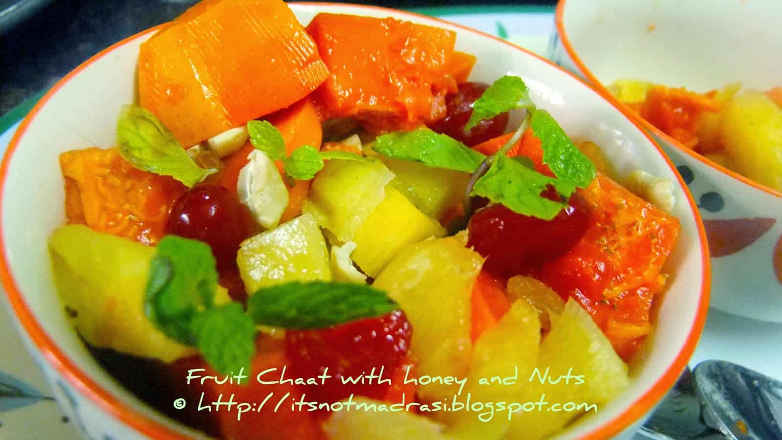 In the first of this series, let's make a simple Fruit Chaat with Honey and Nuts. Well, the best part of this series is it doesn't even need a to - go list and most ingredients can be found easily in any pantry, and you could even substitute one or two of these that suits your palate and kiddo's preferences. I saw this recipe in a magazine recently, and it looksed too good and easy to try it out for the Blogging Marathon.