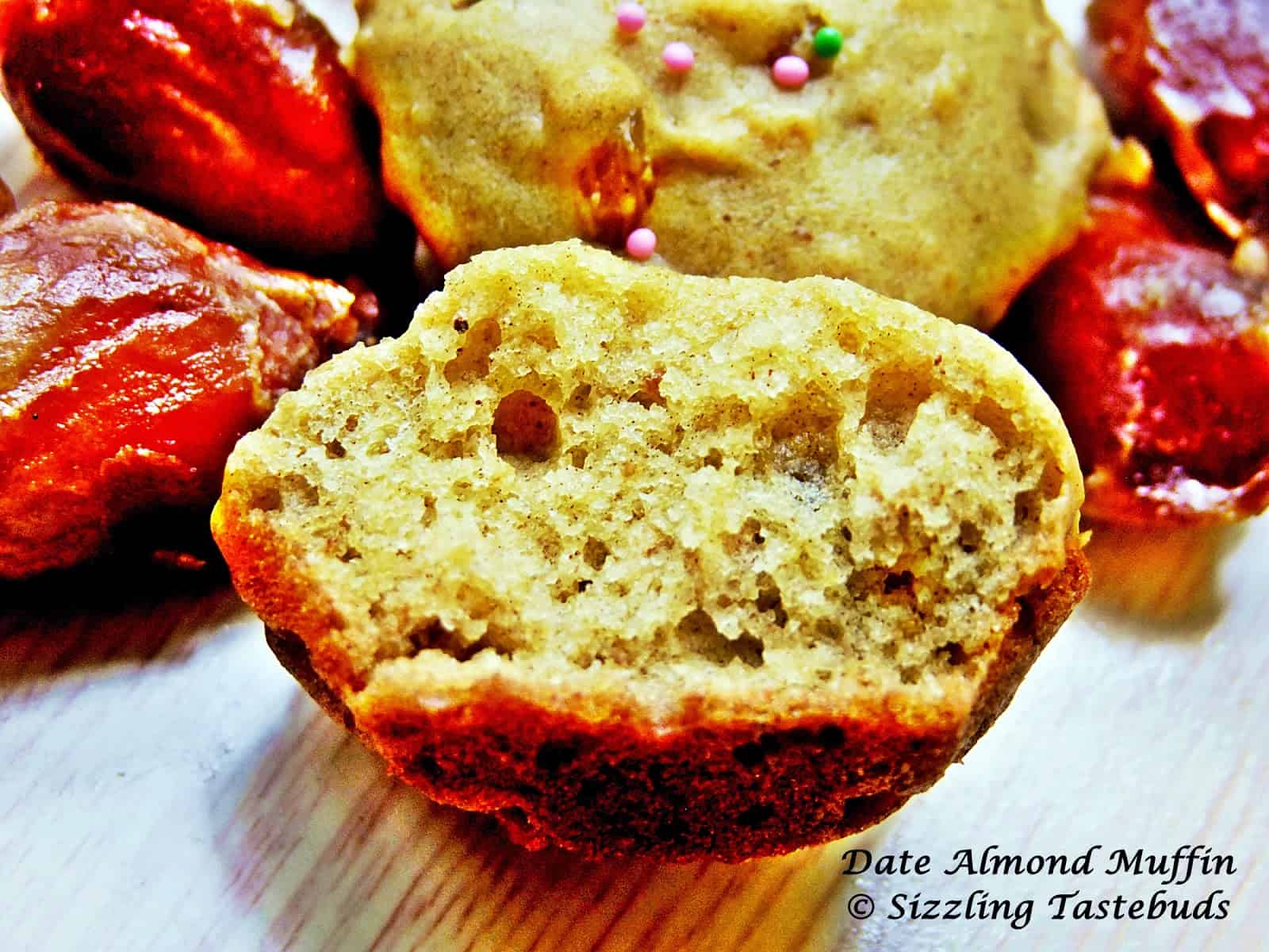 I kept my fingers crossed till it came out of the oven , as I hadnt used any egg substitute either (like flax seed / condensed milk) . But this dessert - Eggless Dates and Almond Muffins- was wonderfully flaky on the top, and soft and moist at the bottom and everyone at home gave a thumbs up to this recipe. The aroma of cardamom-cinnamon flavoured cupcakes wafted through my entire house , and kiddo smelt it up with a wide grin as she rushed back from school 🙂