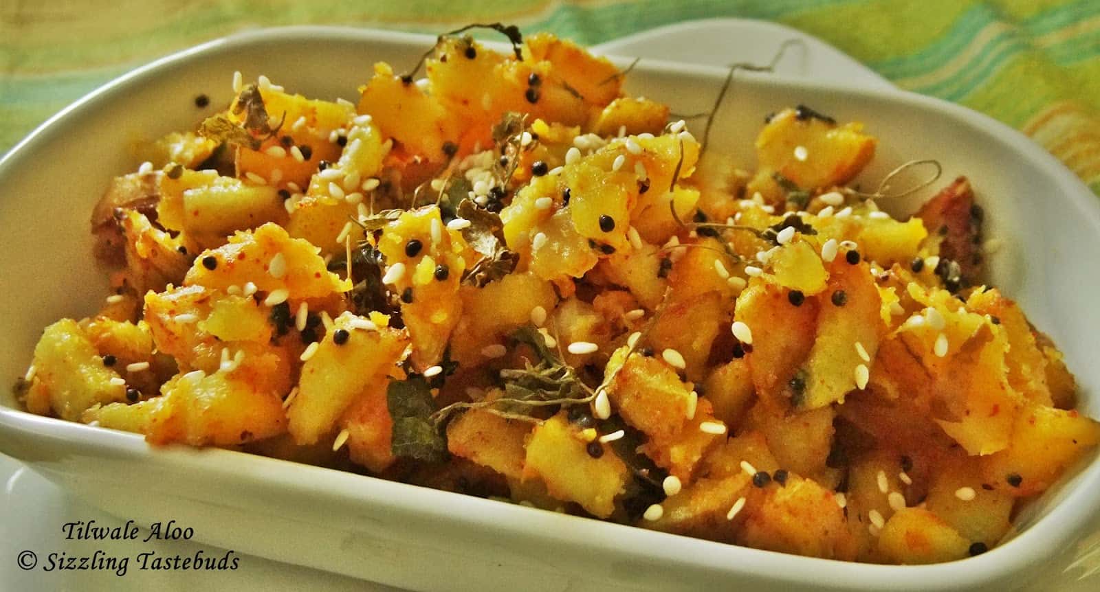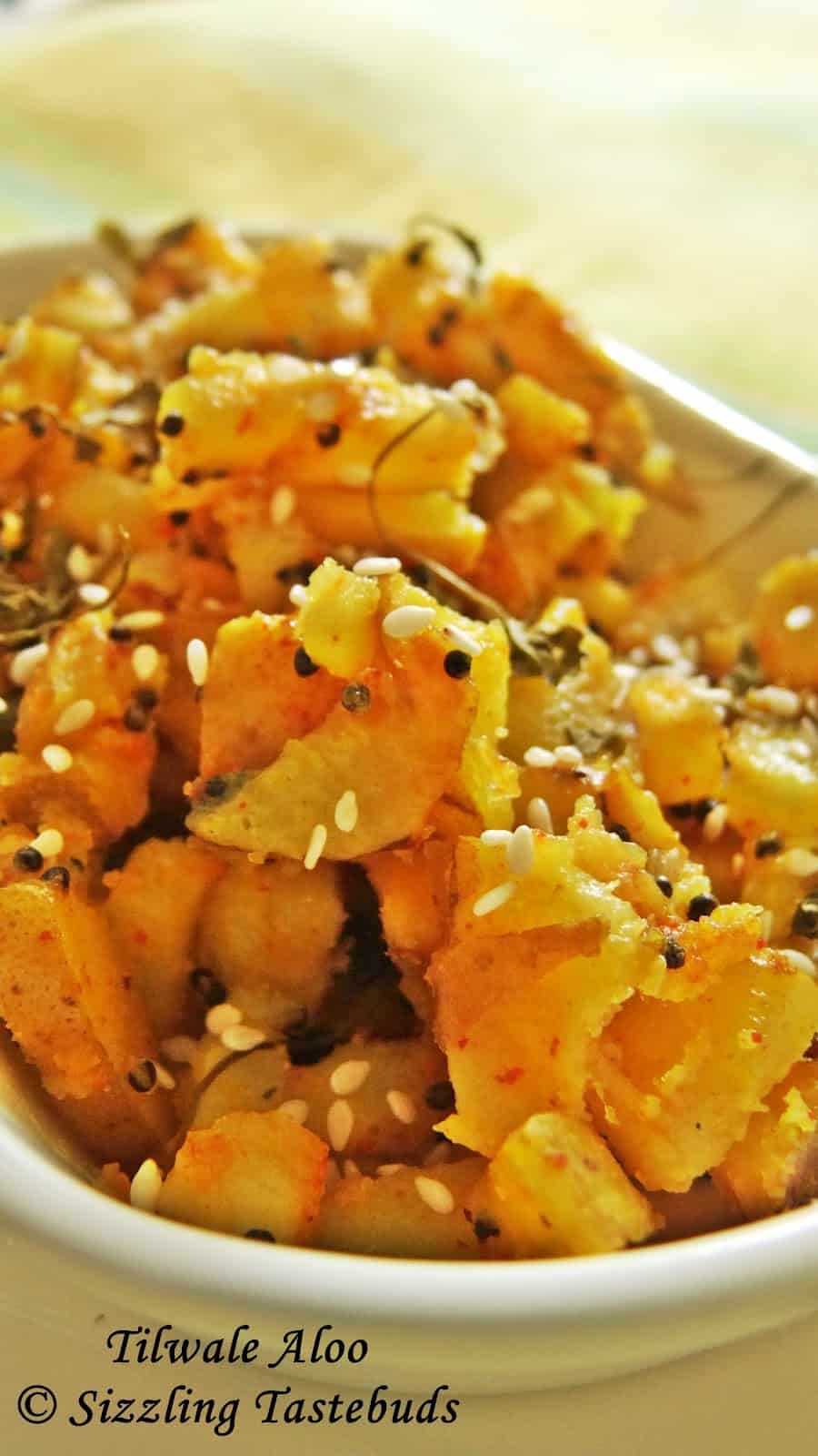 One can’t really go wrong with Potato right ? Wrong. I was flummoxed a few months ago when kiddo stopped eating this vegetable altogether – apart from French Fries (obviously), she didn’t like potato in any form : Cutlet, Tikki or Soup etc. She complained of a strange smell of cooked potato, and I was at wits end trying to figure out a substitute, which came in the form of Sweet Potato that I used for Chaat/ Croquettes/ Baked Samosa / stir fry etc. She quite liked the taste (and smell) of the new vegetable , and left went on sans Potatoes for the little one, till about a week ago, the H and me happened to have this Tilwale Aloo for lunch.