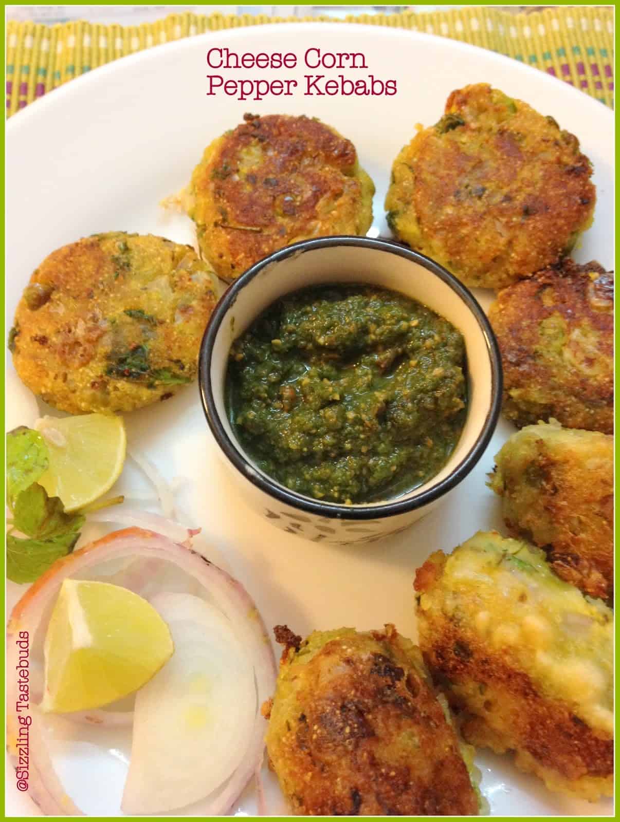 Today's kebab is made with Corn, Cheese and Bell Pepper. Team it up with Green Chutney and / or tomato ketchup. This kebab doesn't use Onion or Garlic but you can add them in if needed.