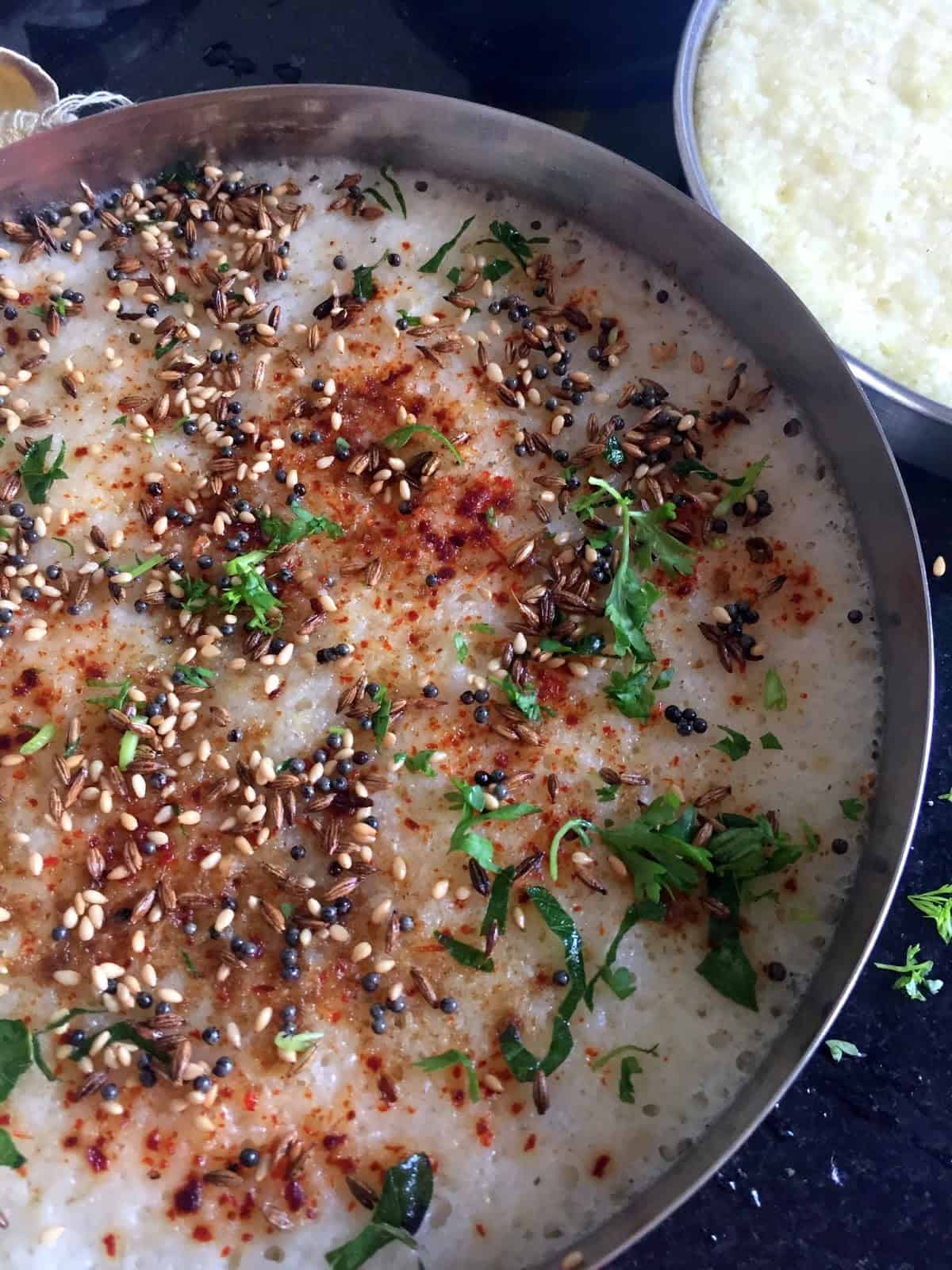 - Beat well, add the soda, oil, green chilly paste, top with the spice powders, coriander leaves, mix and steam in a deep thick walled greased plate for 12-15 mins or till a fork / skewer comes clean.