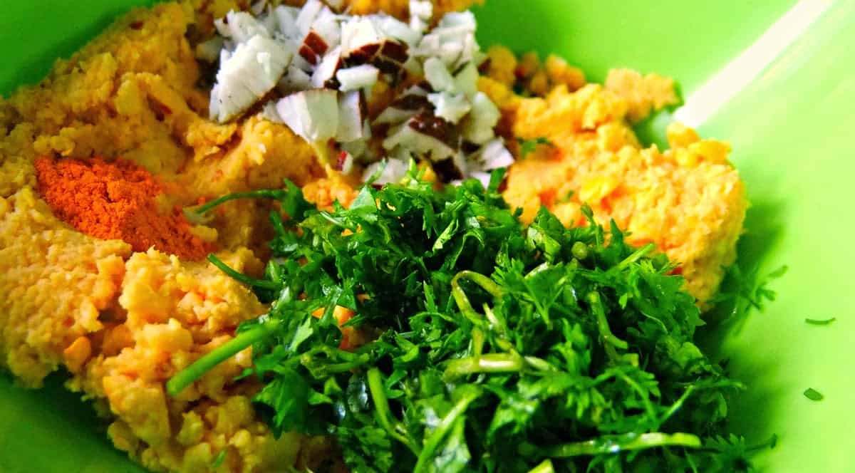 3) Now keeping aside a handful or two of the soaked dal, grind the rest of the dals with turmeric, grated coconut, ginger, chillies to a coarse paste without ANY water. Remove to a bowl.