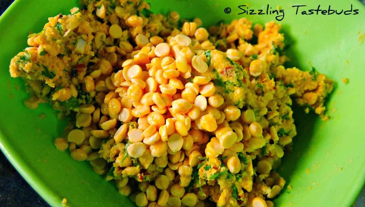3) Now to the pulsed paste, add the whole soaked dals, salt, coriander and curry leaves and mix well. Do not add water at any stage, except while soaking as the vadais will go runny as well as absorb extra oil.