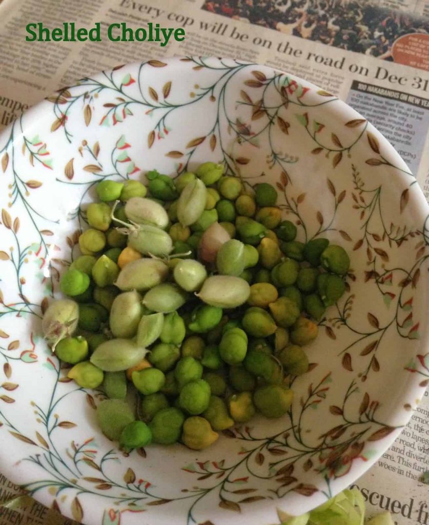 • Add the potatoes, shelled fresh Choliye, 1 cup of water, salt and pressure cook for 2 whistles.