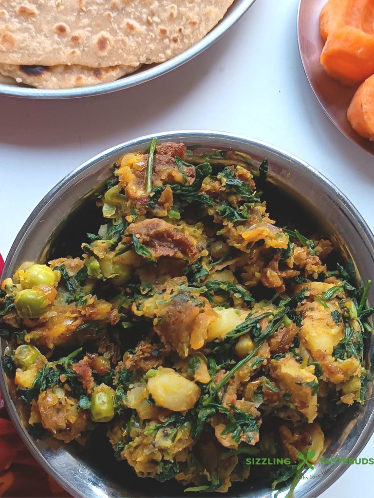 Vegan Methi Malai Matar is a delicious Vegan Curry made with fresh fenugreek leaves and peas. Served with Roti / Rice