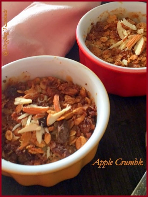 Apple Crumble is a quick to make dessert for party, potluck or just to indulge as is. Served warm as is or with a scoop of ice cream!Pin