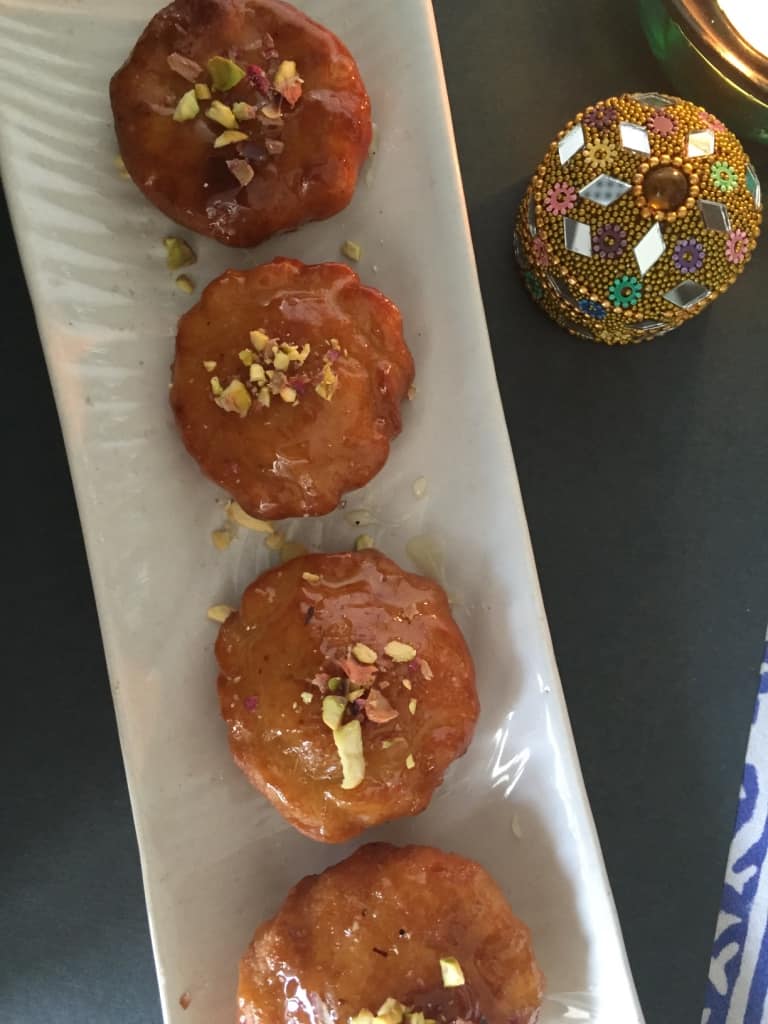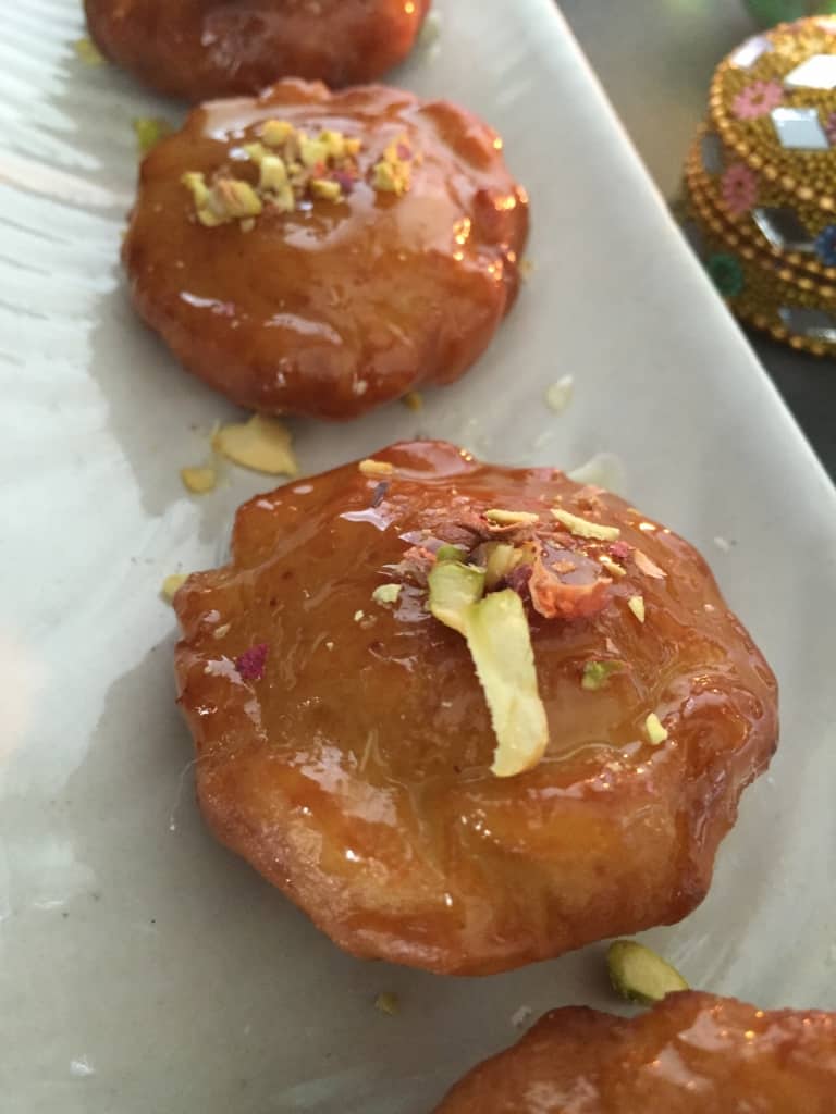 Drain to a colander and then soak in the warm sugar syrup for 3-4 mins. Then remove with a slotted spoon and place on a greased / parchment lined tray. Repeat till all is fried and soaked.