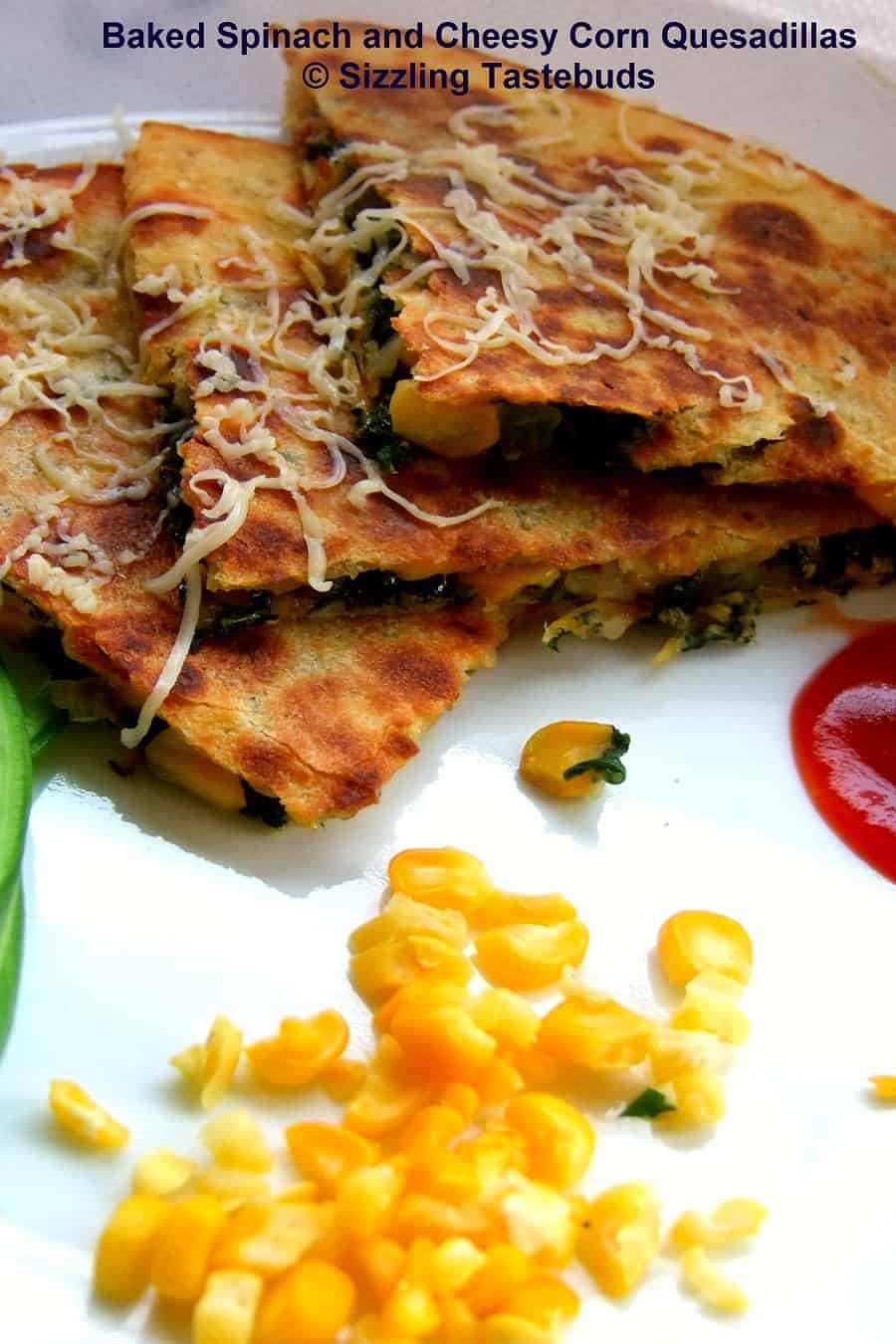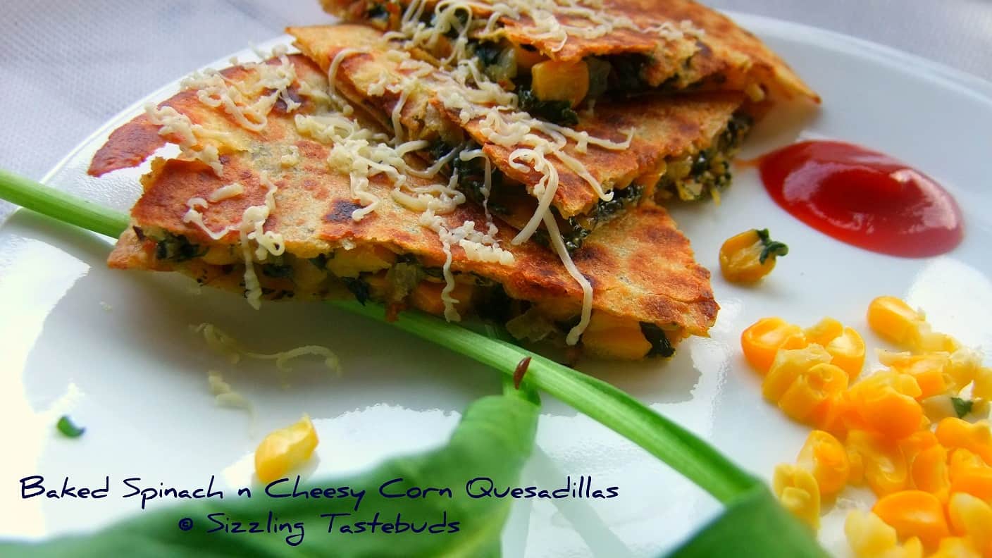 Spinach and Corn-cheese - creamed, grilled, sandwiches, Quesedillas - they never fail to please kids and adults alike. I tried out this Baked Spinach and Cheesy corn Quesadillas last evening and kiddo who generally takes a long time to be persuaded to a new dish took to this immediately, also saying she wants this at her birthday party next year (which is almost 7 months away - kids have a way of planning their birthday party for next year, almost from the next day of the last one :-)) Anyways, i was happy at adding one more healthy dish to the menu. This dish originated in Mexico, and the name is derived from the Spanish word queso (cheese). You can substitute the spinach with any greens of your choice or just make it with only veggies, and no greens. You may add a teaspoon of green chutney or even sprinkle chilli flakes if you want this spicier.