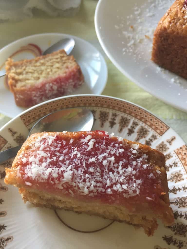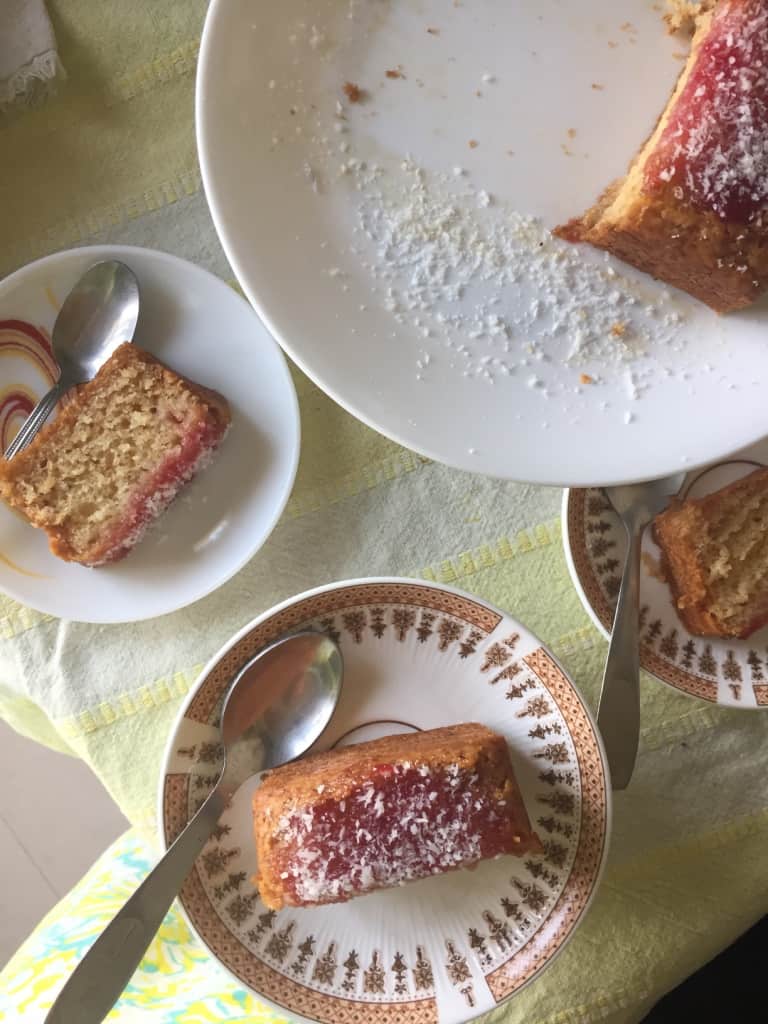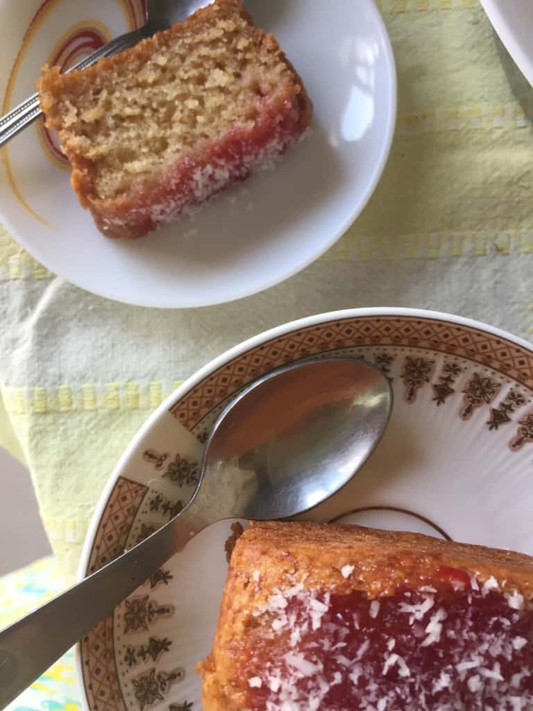 Microwave the jam for a few seconds till slightly melted and runny. Spoon it all over the soaked cake and drizzle the dessicated coconut. Wait no longer, slice and enjoy the nostalgia 🙂
