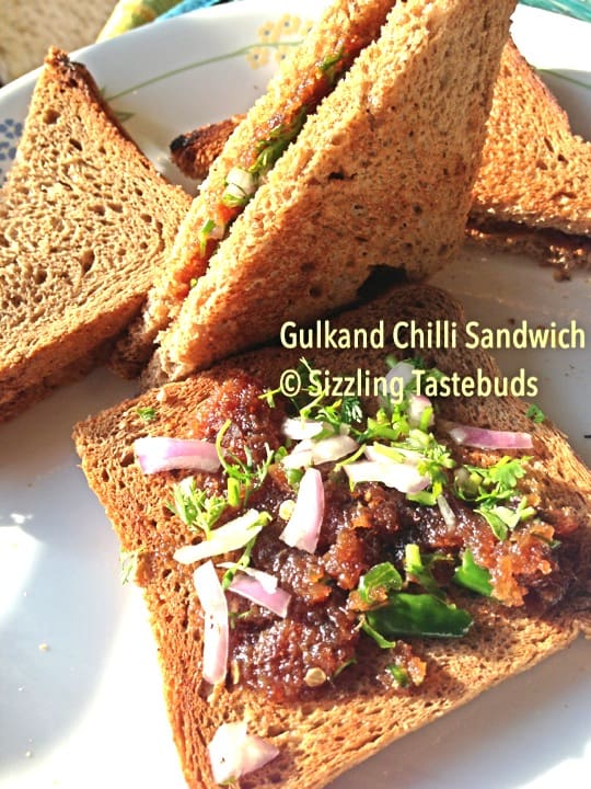 delightful yummy sandwich with Gulkand (Rose Petal Preserve) and chillies (Bell