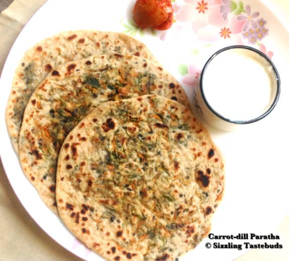 Parathasare welcome anytime in my family, be it for breakfast or lunch.. Considering that it takes a Herculean task to get my elder daughter to eat veggies now,they get disguised in parathas. This simple no fuss Carrot-dill Paratha is simple to make, pairs well with simple yoghurt and pickle. Carrots are also a favourite at my place, and we love the low fat Carrot-Raisin Bonda , the Carrot Cheese Burger as much as Carrots-Oats Muffins, with the eternal favourite being Carrot Kosambari (or salad) - more for its simplicity and taste than ease of making it 🙂