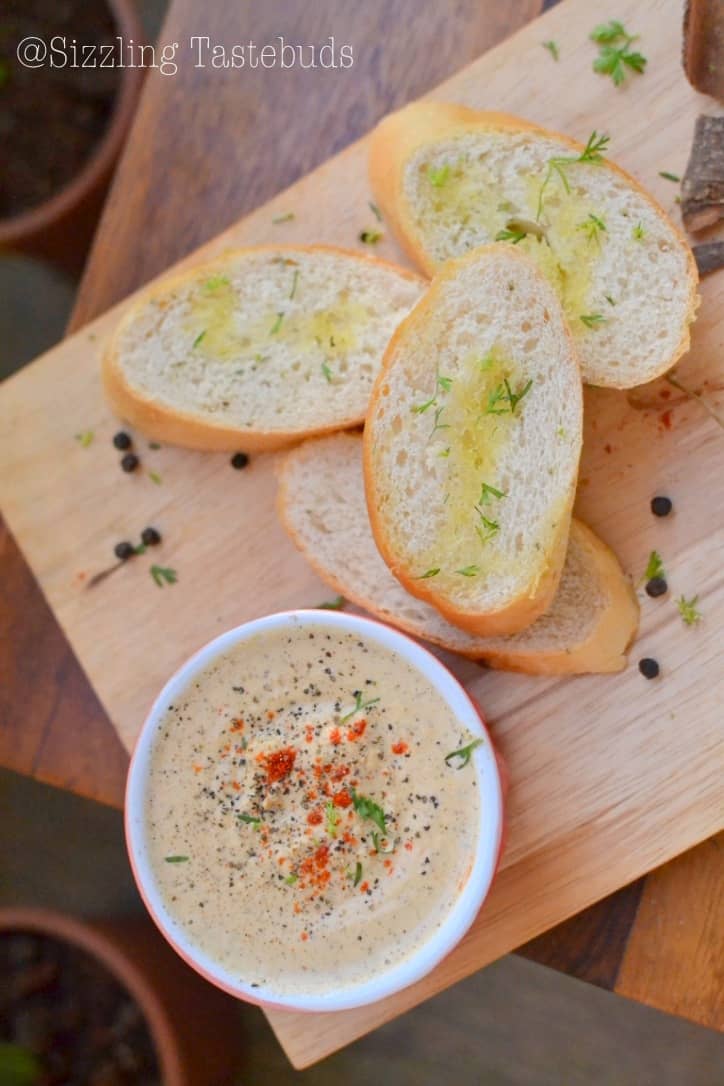 2. Serve immediately with veg crudités / soup sticks or any bread 🙂 Top with chopped parsley, some more olive oil, black pepper powder & cayenne pepper.