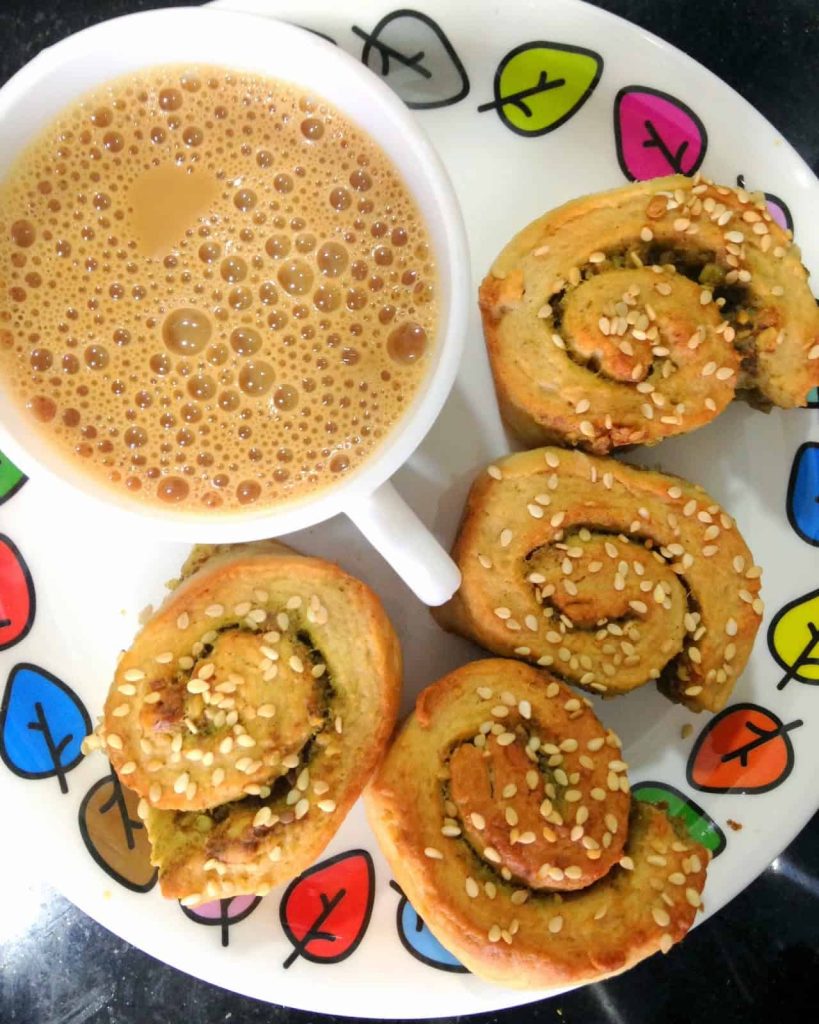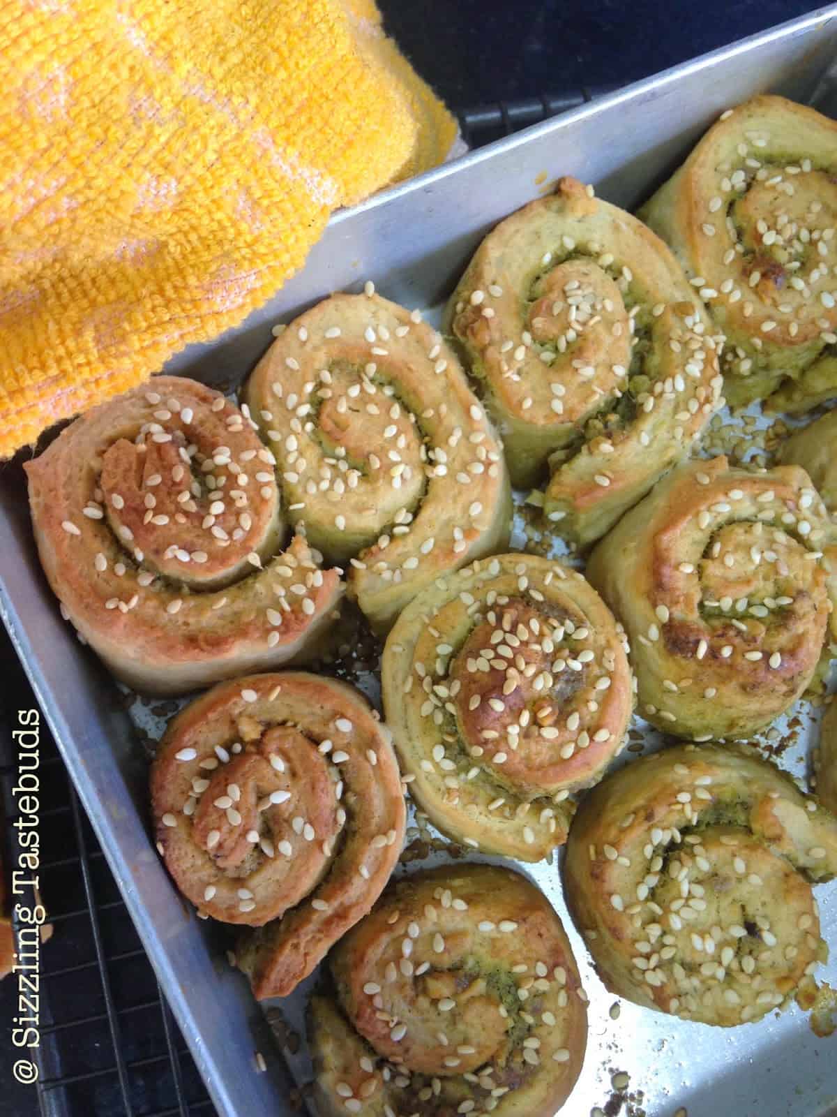 Coriander Garlic Pesto rolls is a great snack for parties or dinner. Baked to Golden perfection with wholewheat flour, garlic pesto and everyday spices.