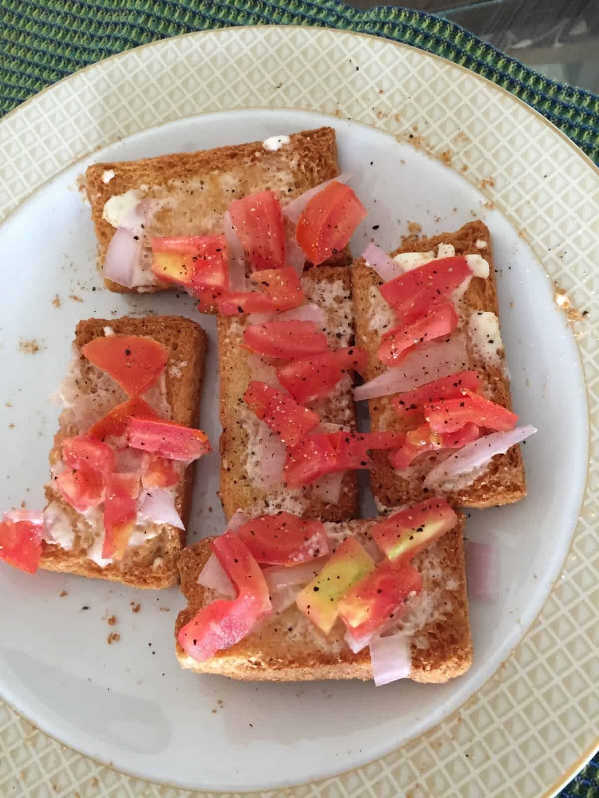 Whisk the cream cheese with crushed black pepper & olive Oil. Add half of the chopped tomato, onions, mix & spread this on the rusk or toasted garlic bread. Top with remaining tomato, more crushed pepper & serve immediately.