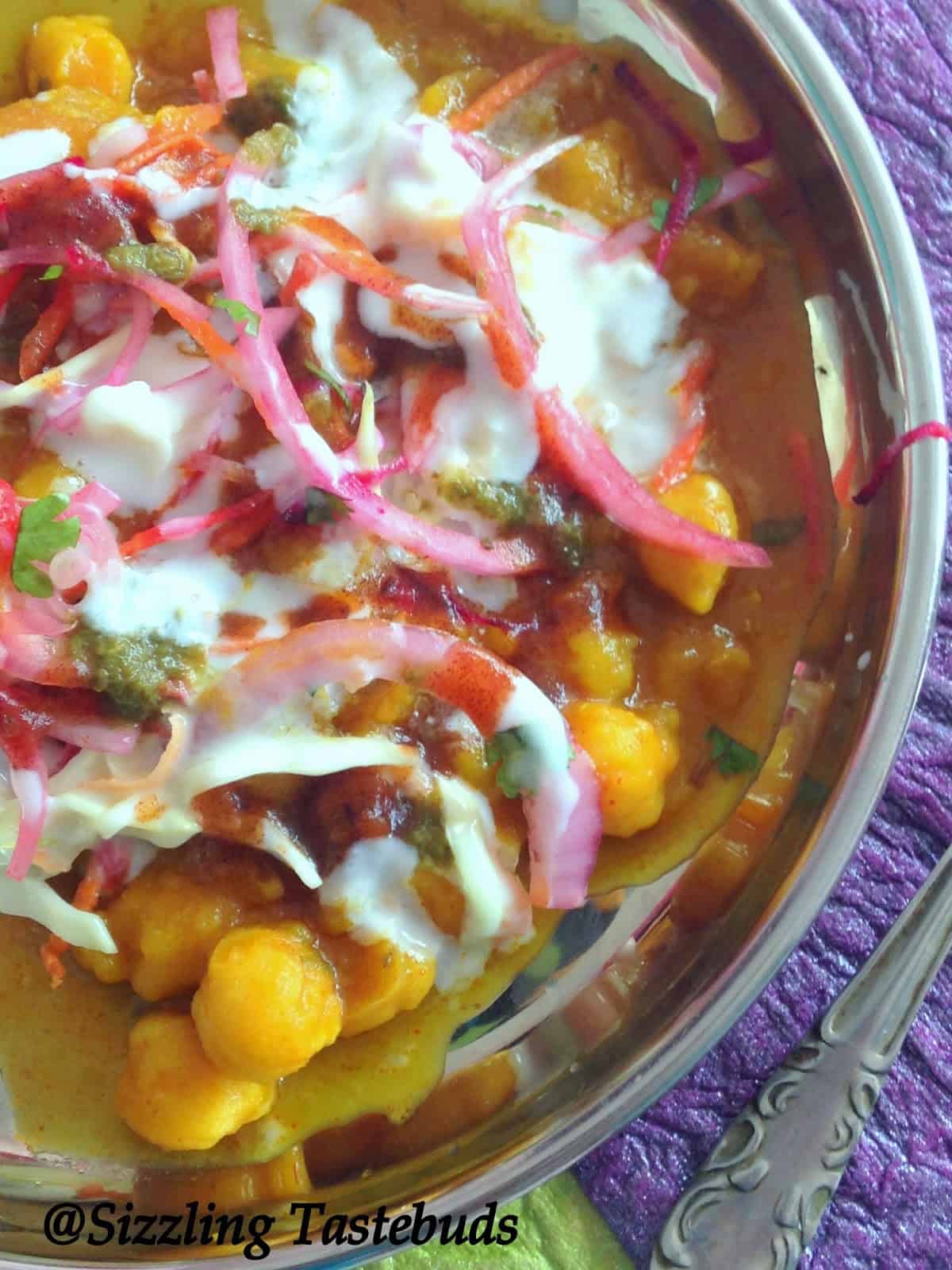 Addition of yoghurt is a must to this chaat to balance the heat from the fiery