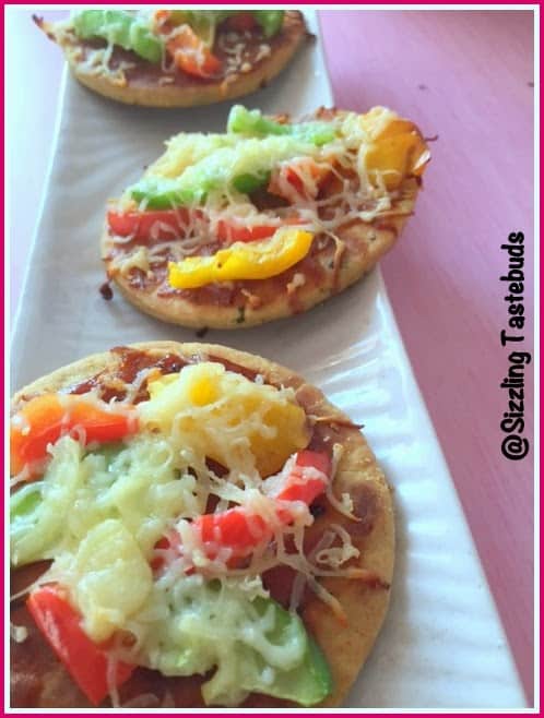 Cool them slightly, apply a layer of pizza sauce, top with veggie-cheese and Bake for 4-5 mins till cheese slightly melts (took just under 6-7 mins).