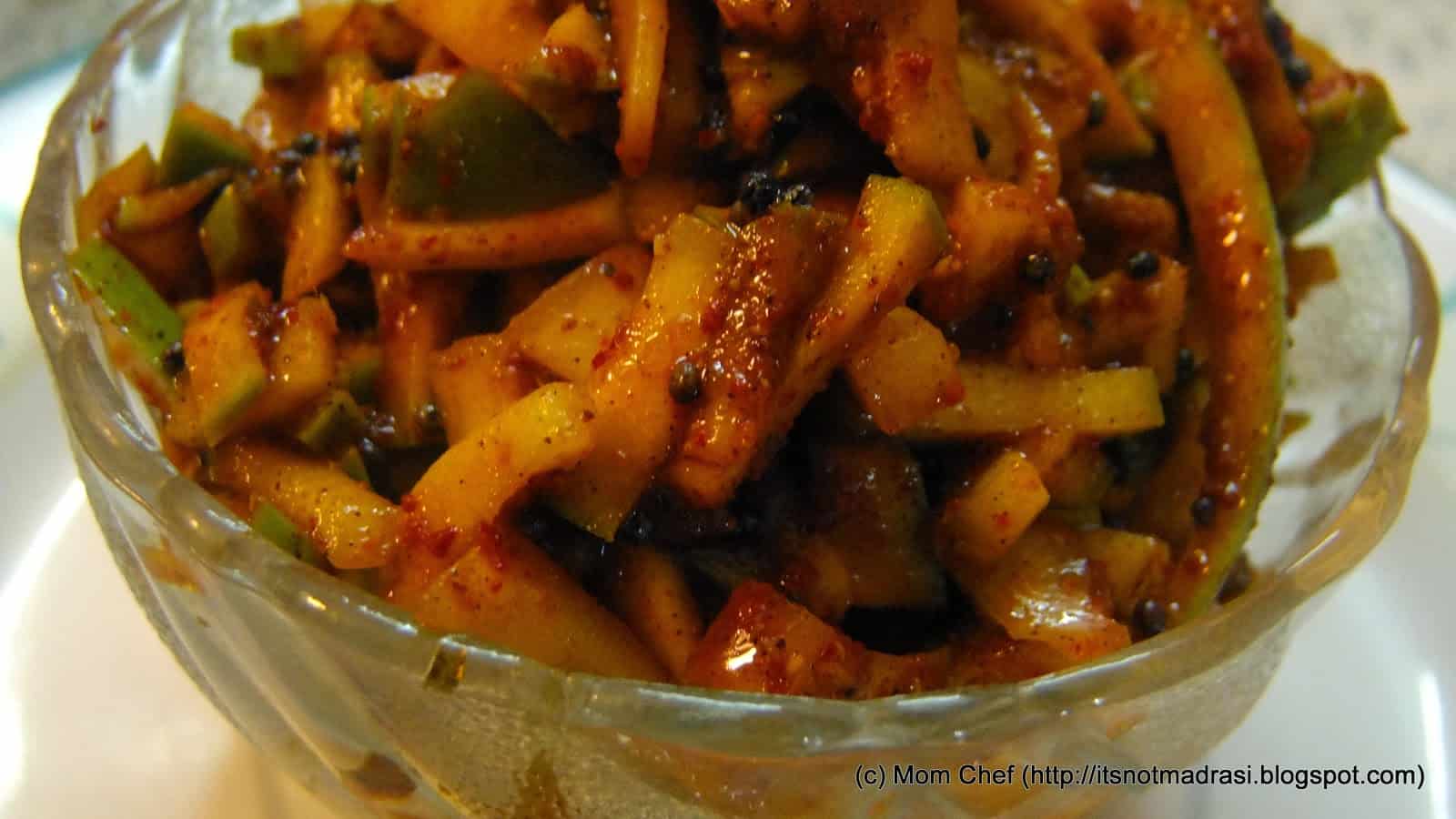 With dal rice, parathas, curd rice, dosas etc, today's Instant Mango Pickle is easy on the palate and preparation too ! I have used the kairi (raw mango) calledTotapuri /Gini moothi(meaning raw mango shaped like a parrot's beak) for this pickle. I remember my school days where we drooled over slivers of quasi-ripened Totapuri mango served with a dash of red pepper bought at a vendor during lunch break or after school hours!! slurp !! 🙂