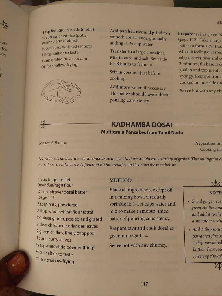 I have made this Kadamba Dosai (original recipe pic from the book as below) with some minor modifications every time. Its our go-to dosa on Mondays mornings when I have no fresh Idli batter ground the previous week. And this dosa batter gets done in a jiffy (with some quick prep). If you like Dosa varieties like us, why not try this Quinoa Dosa (without rice)