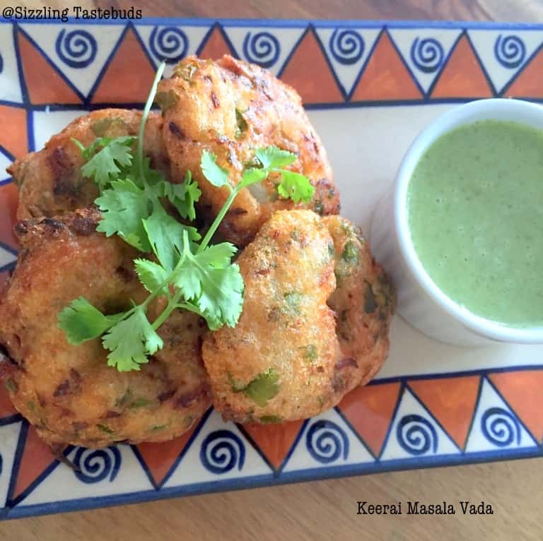 Keerai Vada or Masala Keerai Vada is something I have noticed recently in Tamilnadu hotels for the evening snack. I had this in 2013 when we stayed in Chennai for a few days for a family function. It tasted like the normal Urad Dal vada (aka Ulundhu Vada / Uddina Vade) available in Bangalore, but something was refreshingly different. A cousin of my husband told me the recipe that she followed, and I liked this version a lot. This can also be made with the Instant Homemade Vada Mix and that too turns out fab!
