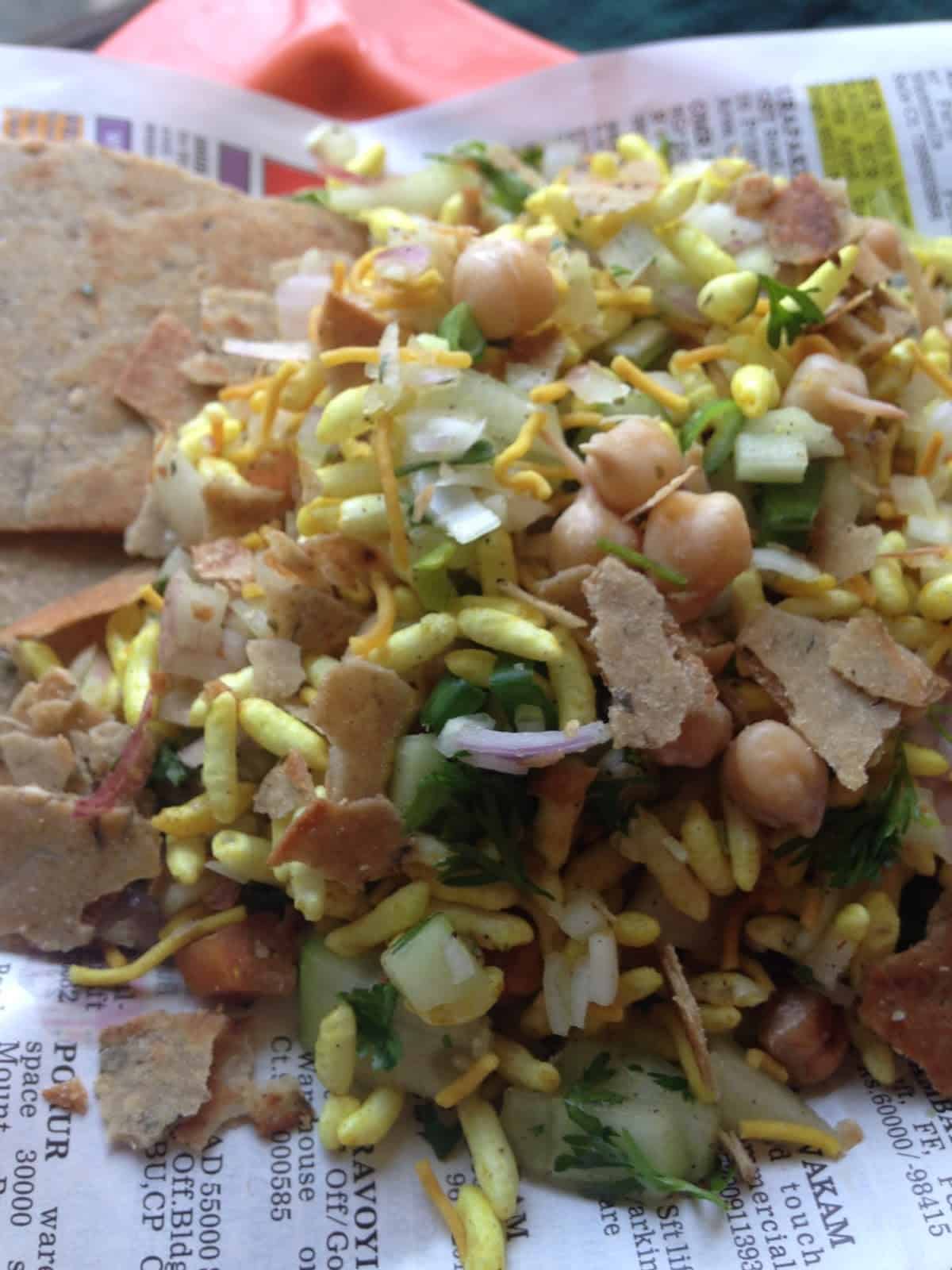 I wondered what was so special about it, and then he said Khakhra Channa Bhel ! One bite and I was sold :-)) I havent seen anyone selling this now, but my friend tells me something similar is being sold inside the mumbai suburban trains (yeah there are food vendors ON the running train and they hop on , hop off between stations making the most of the evening snack time to make a quick buck)