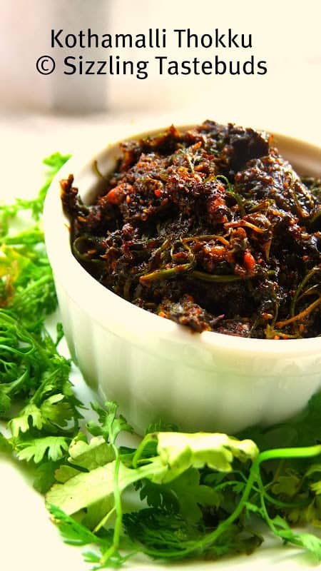 This one definitely has my grandmom's recipe written all over it. As I write this post, I remember her slaving over the dim lit kitchen hovering over a large iron Kadai (pan) while the aroma of this earthy and heavenly Kothamalli Thokku wafted through the house, while we walked in right after school. We waited hungrily as this thokku would be mixed up with steamed rice and gingelly oil and wolfed down at dinner time. And even in the time of no refrigerators, Paati made sure that she bottled them in glass containers (that she called jaadis all the while preserving them for a good fortnight or two - if they lasted that long !!). This side dish goes even well with hot chapatis / dosas alike, and keeps well for about a month under refrigeration. You may also use this as a quick chutney to mix with rice & ghee for a lunchbox item teaming it with potato wafers 🙂 Yumm !