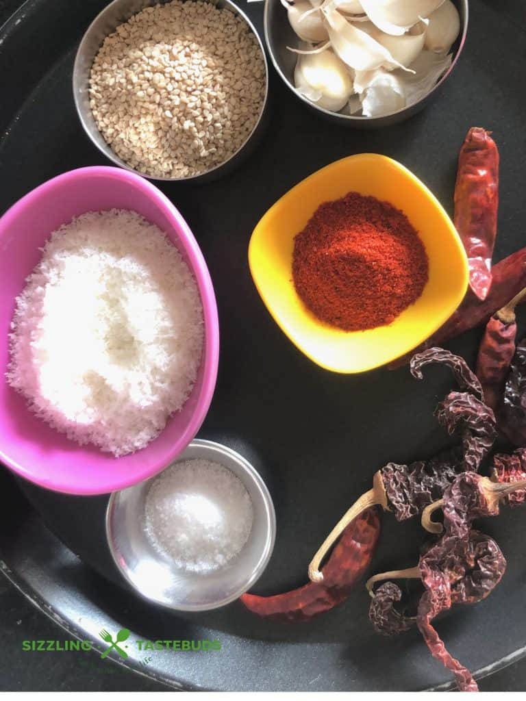 • Finally add dry garlic (you may also use 15 fresh pods instead), salt and Kashmiri Red chilli powder. Blitz till coarsely powdered