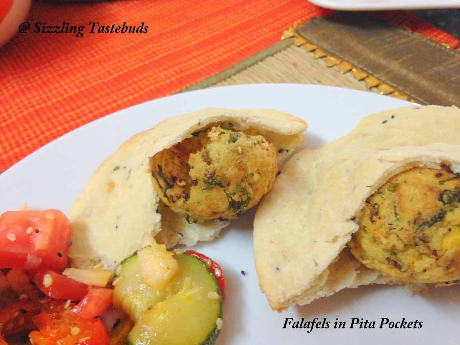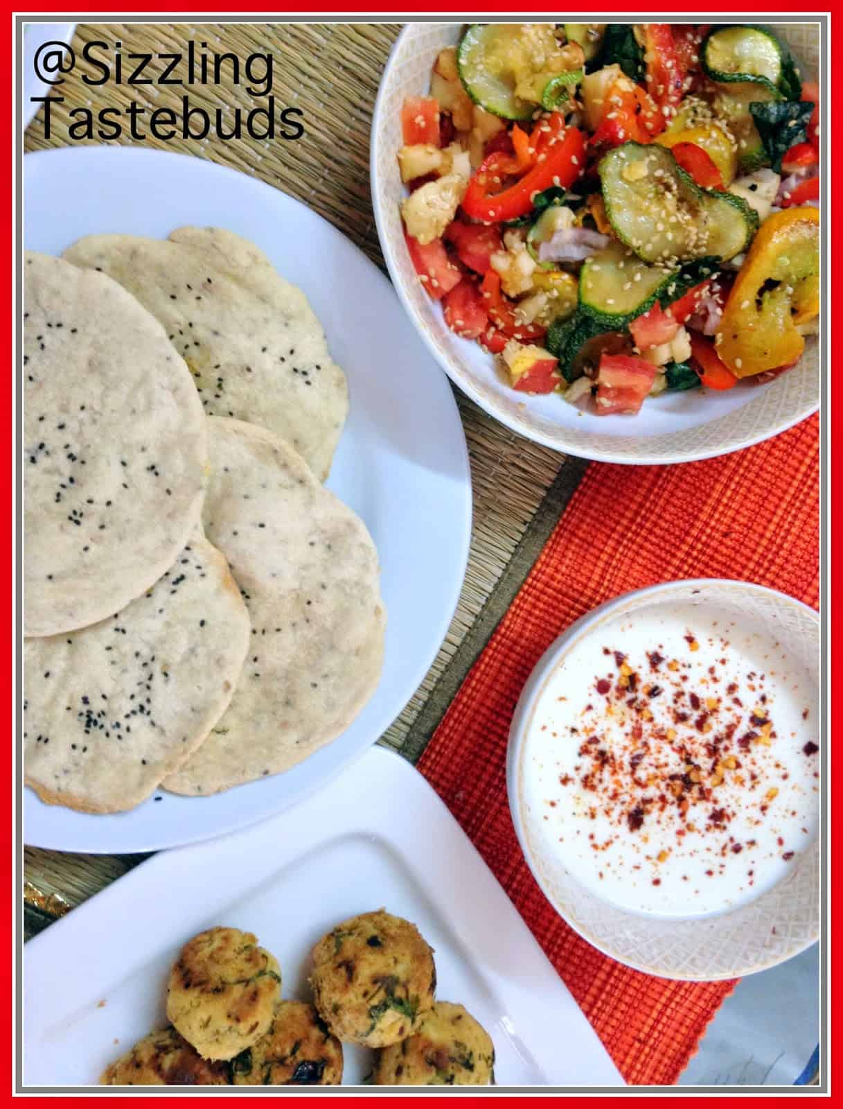 meal comprising of home made Pita bread, baked Falafel and Roasted Veggies. Tzatziki is also served usually with this, although I made a spicy yogurt dip. My