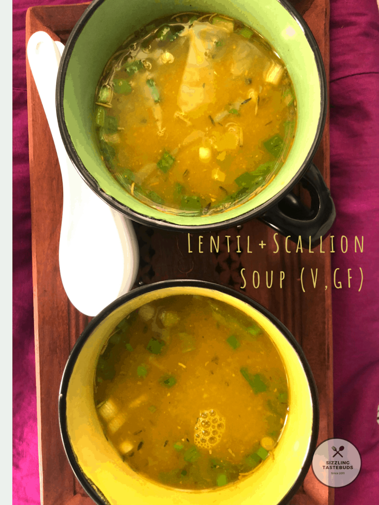 Lentil Scallion Soup is a nutritious and light Gluten Free vegan soup with scallions and lentils in a homemade broth. Perfect for rainy or chilly days as dinner / brunch.