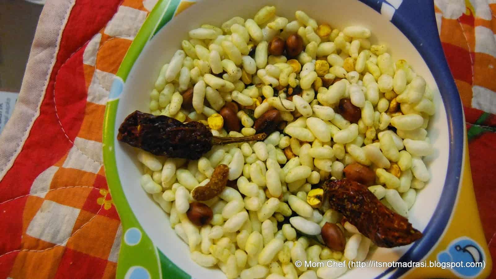 Masala Murmura is a quick to make, almost-oil free and healthy snack for kids. My little one loves this and calls this Sukha Bhel (not quite a misnomer), and I make this quite often at home . Murumura (Puffed rice) is called Kadalepuri in Kannada, and for all those from Bangalore, you would remember those hawkers in Lalbagh / Cubbon Park peddling these Masala Murmura cones over a hot coal pot !!