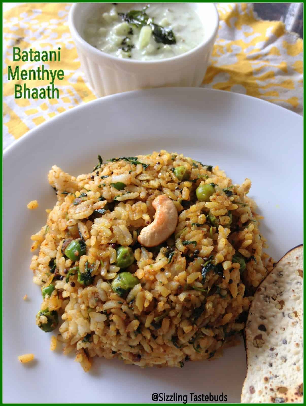 Menthye bataani bhath (in Kannada, Menthye means fenugreek leaves, Bataani means peas and Bhaath means rice) or a spiced rice dish with fresh fenugreek leaves and fresh peas is a very aromatic and spicy one pot meal. Whats more, its Vegan and Gluten Free too 🙂