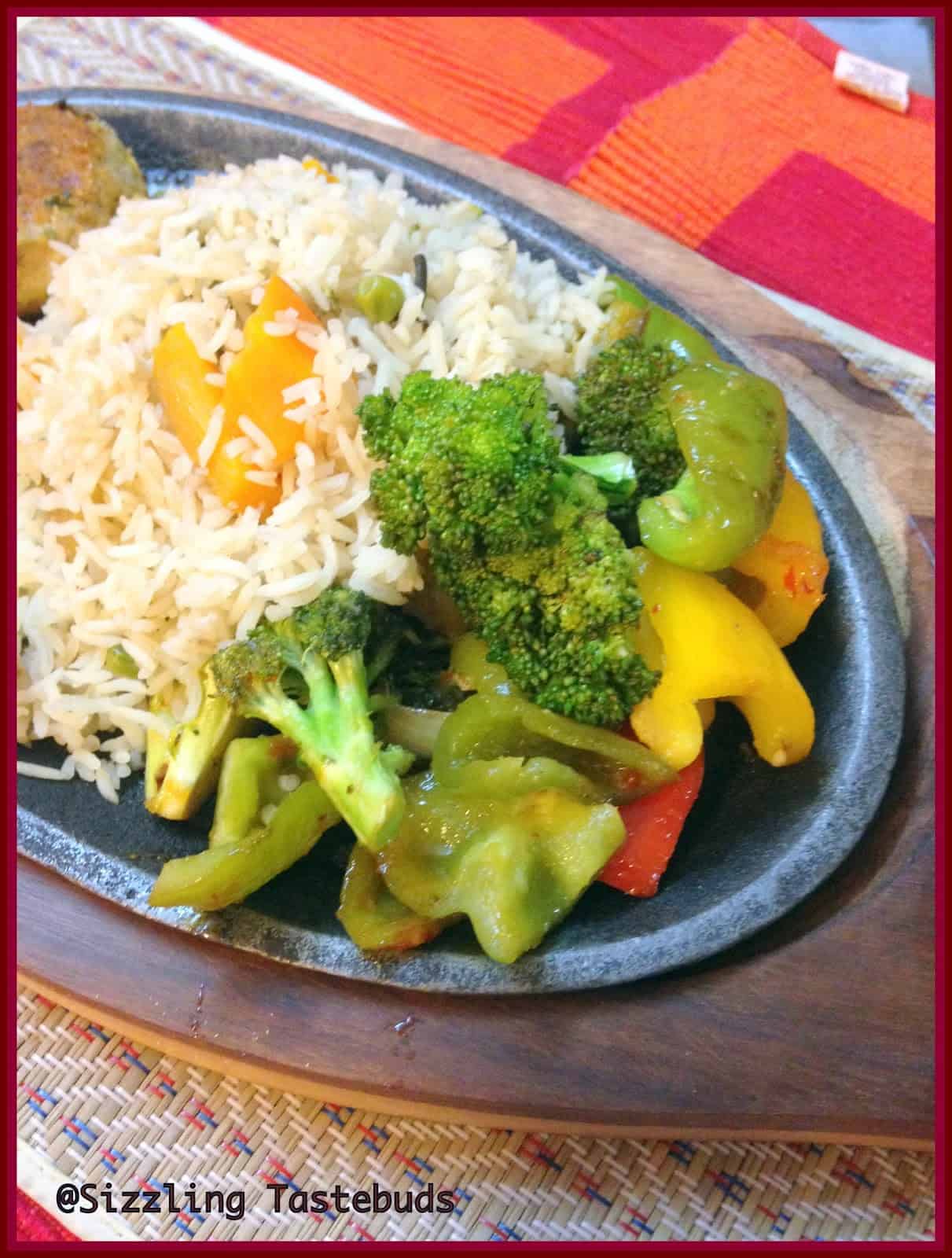 I begin the series with Mexican Veg Sizzler with Roasted veggies, garlic pepper rice and