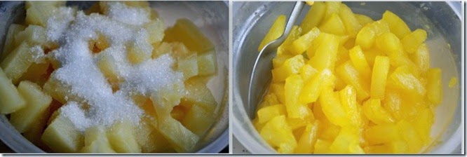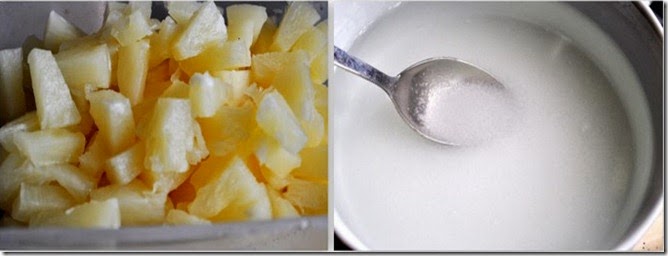 Chop the pineapple into small pieces and keep aside.Add water in a oven safe bowl and dissolve  1 cup sugar in it.Reserve 2 teaspoon sugar for later use and keep it in oven for 2 minutes.Stir between at every 30 minutes.