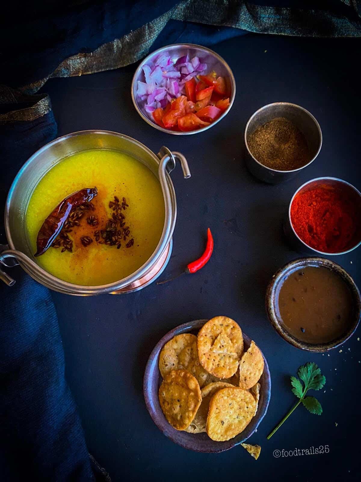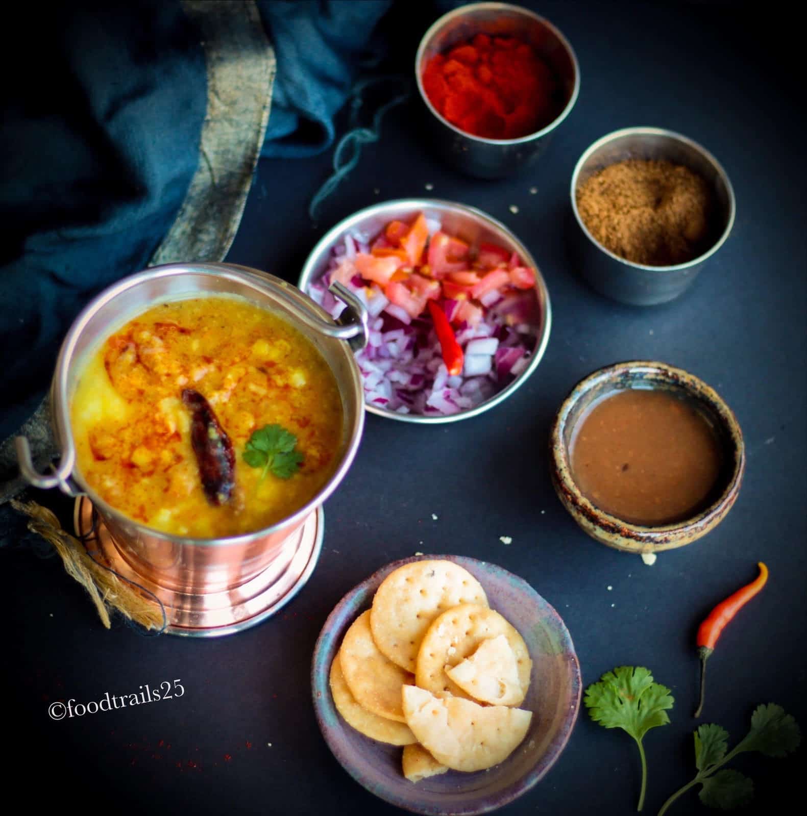 This is not served for main course but as starter/snack. Every home has their own favorite topping for this dal, but it is cooked in most simple ways.