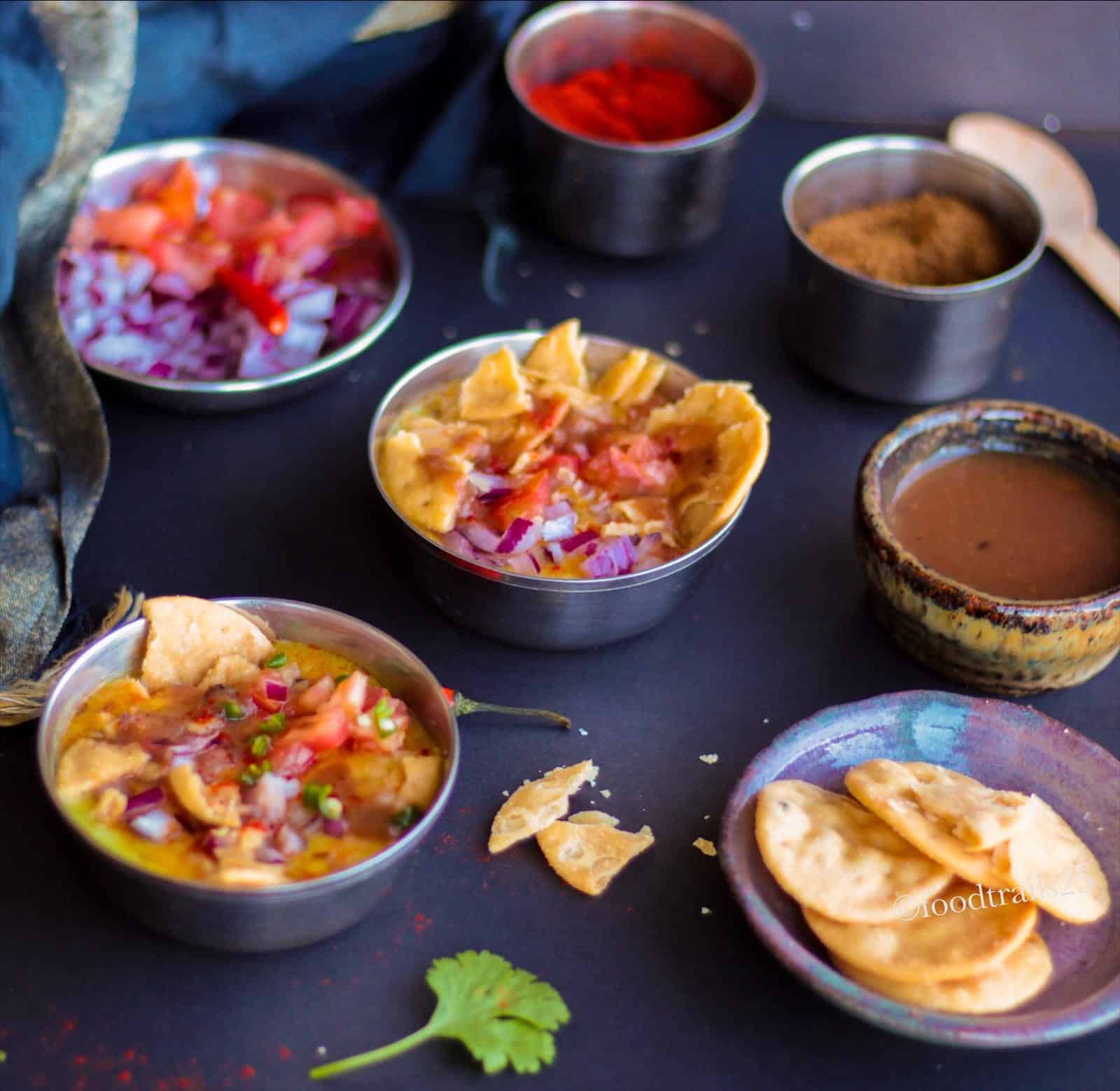 - Divide in small bowls, top with finely chopped onions. tomatoes(optional), green chilies( skip when serving to kids), sweet tamarind chutney. You can add green chutney too. Or, can also add lemon juice if not using Tamarind Chutney.
