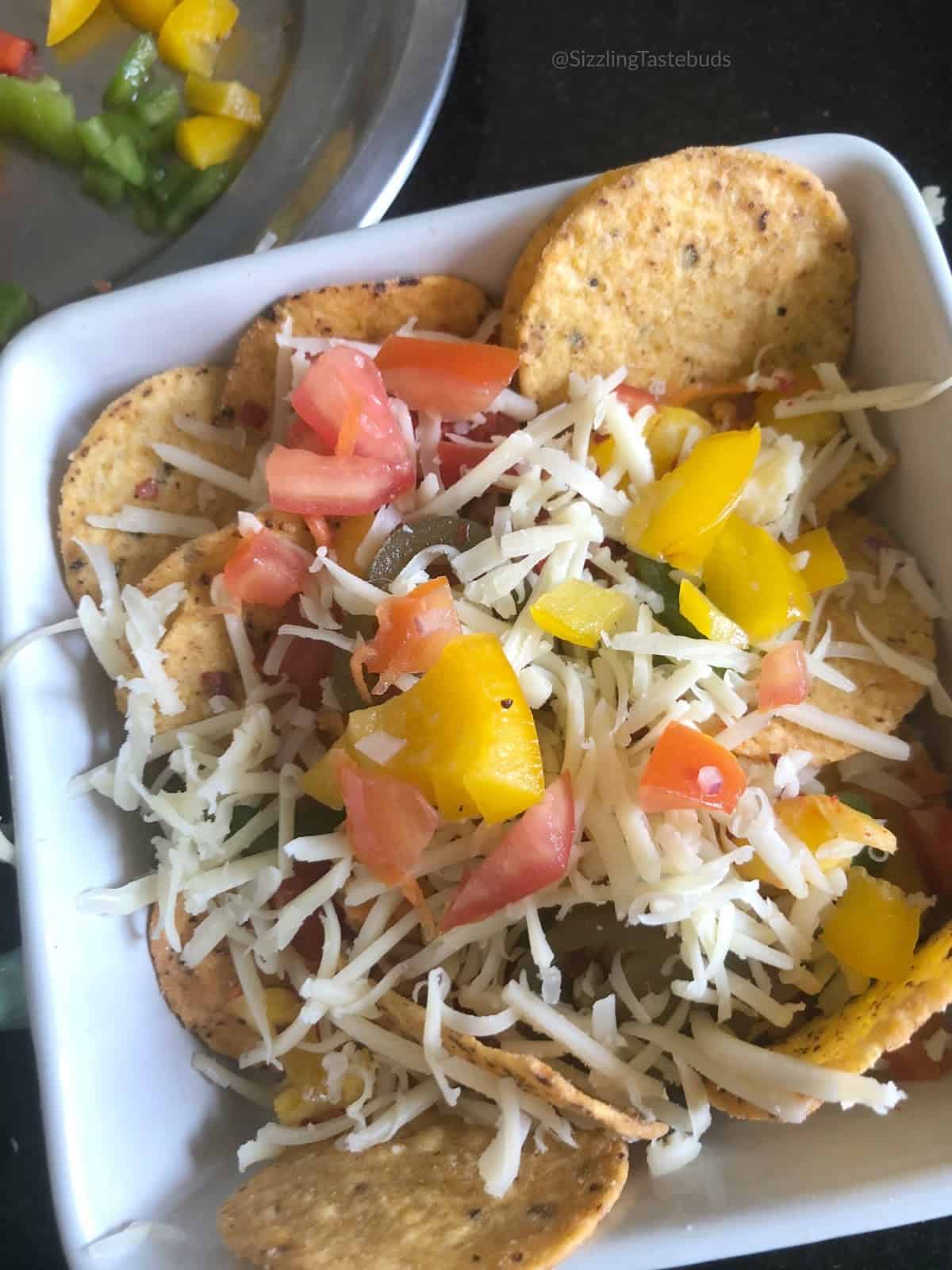 - Place the nachos in a oven proof /micro plate. Spread cheese and bake slightly till the cheese melts.