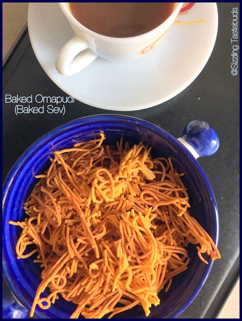 Omapodi or Sev is a popular snack at tea time. Oma in Tamil means Ajwain / carom seeds and Podi means bits ...so its basically a snack flavoured with Carom seeds and crushed into little bits before consuming. Colloquially, this is also called "Ompodi"