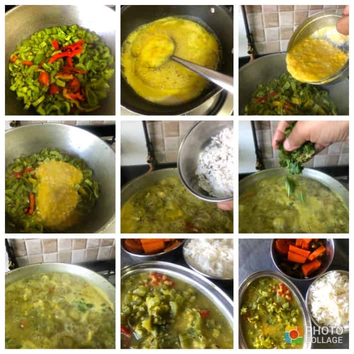 1) You may use Toor Dal also sometimes along with Moong Dal.  But I find using the latter makes you feel light, while Toor Dal might makes this dish a tad heavy. But whichever dal you use, dont mash it up, but try to boil them till they are soft, but not mushy.
