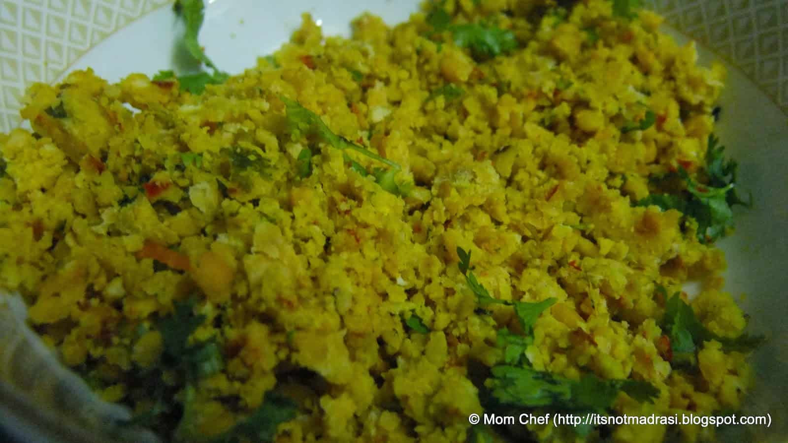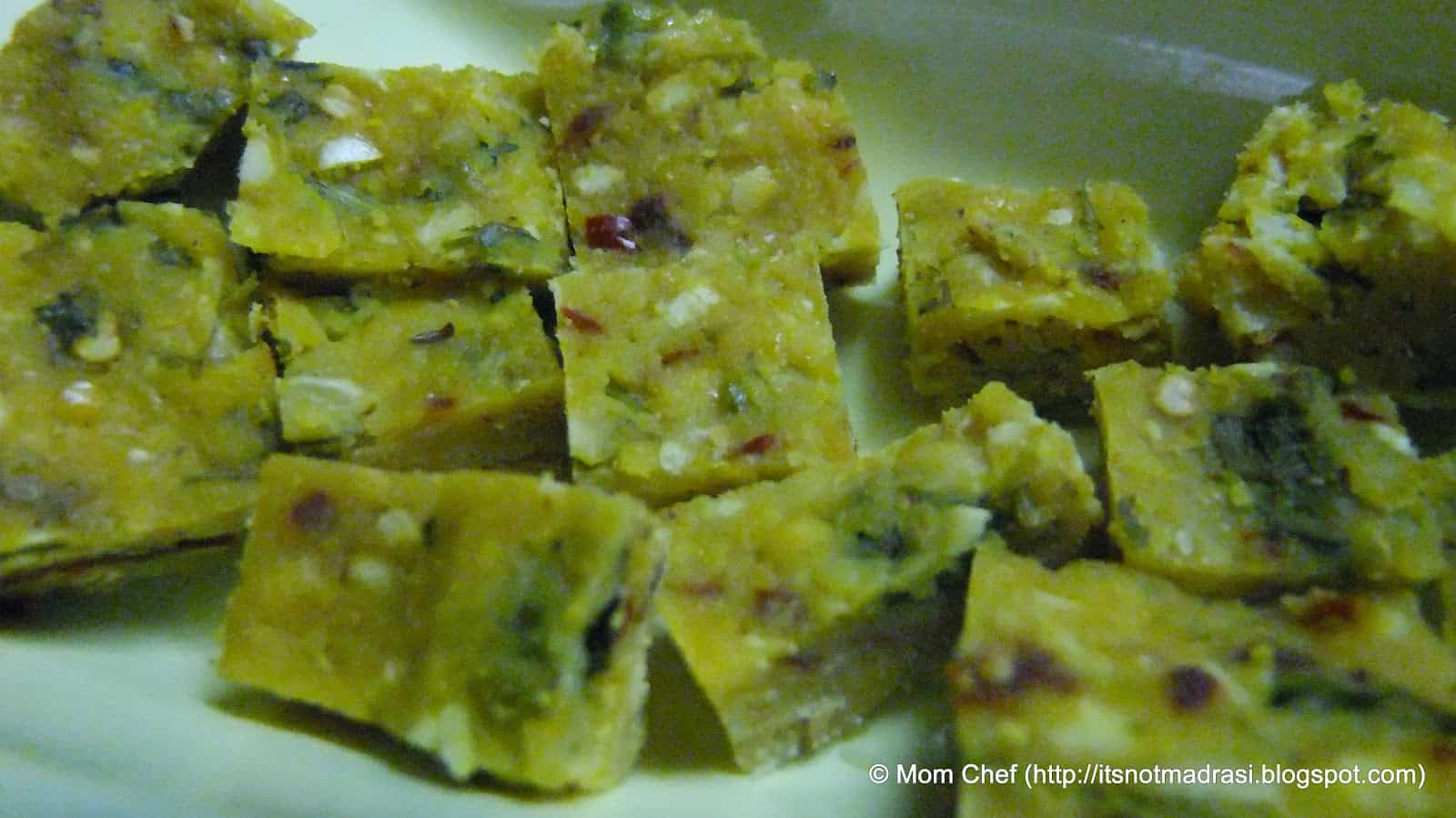 7)     Unmould the steamed savoury cakes and cool (from step 4 above). Crumble into burji consistency. Additionally, you may eat these healthy  savoury cakes as it is (refer pic 1)