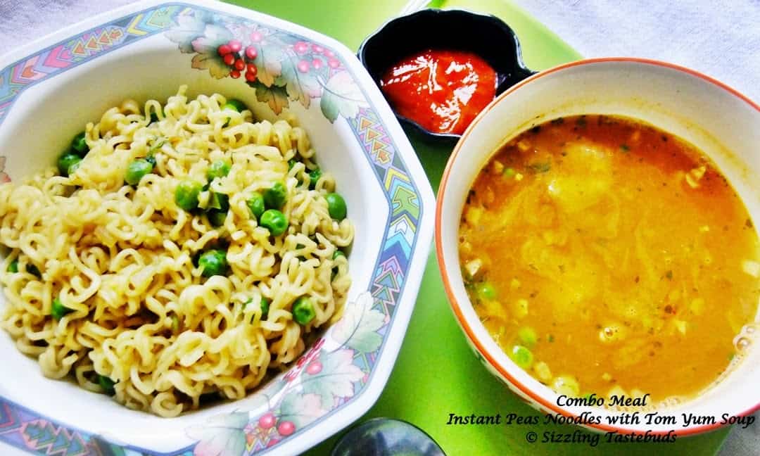 I was talking to someone the other day, and the topic veered to comfort foods. While my first choice would be Rasam with Rice, the 2nd and more obvious choice was Maggi Noodles. While there is a bit of summer still lurking around Mumbai, the evenings have a slight nip in the air, which makes you crave for hot comforting foods. While I try best not to deep fry, the entire day's chores leaves me with very less energy for baking on a regular basis- enter Maggi to the rescue. While today, I wanted to make this a whole meal by itself, I also made Peas Noodles with Schezwan Tom Yum Soup (without cornflour / MSG) with carrots and veggies, and boy , did we enjoy the wholesome meal. This is also a healthy lunch option as well. You can play around the ingredients a bit and spice it according to your palate. The warmth from the soup and the homemade noodles is sure to soothe your senses. And kiddo, who doesnt take to new food immediately loved the 'indianised' version of this Tom yum Soup and pronounced it as 'tres bien' (very good).. Now, what more could I want? Lets get to the recipe...