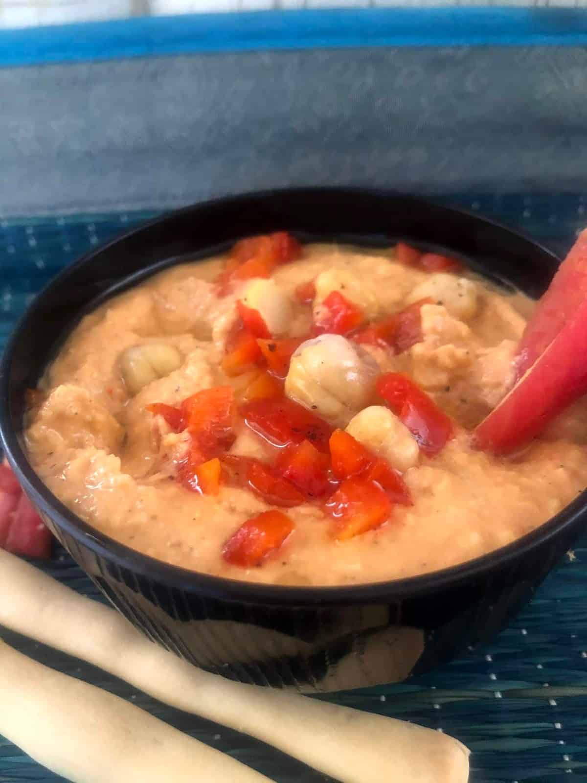 Well, we are huge fans of chickpeas and there’s always a stock of cooked frozen chickpeas In the freezer. So out came the chickpeas and teamed with this roasted bell pepper (see pics below for details), this was the quickest dip I made before rushing off to the dreaded dentist appointment!!