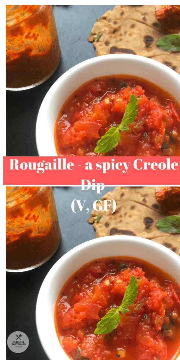 Rougaille (pronounced as roo-gahy) or Red Sauce or Spicy Sauce as its known in Mauritian Cuisine is believed to be a hot (pun intended!) favourite amongst the locals. Mauritian Cuisine is a blend of Indian, Arabic, French /  Creole cuisine.  This dip is almost a National Cuisine like the Roti /Farata.