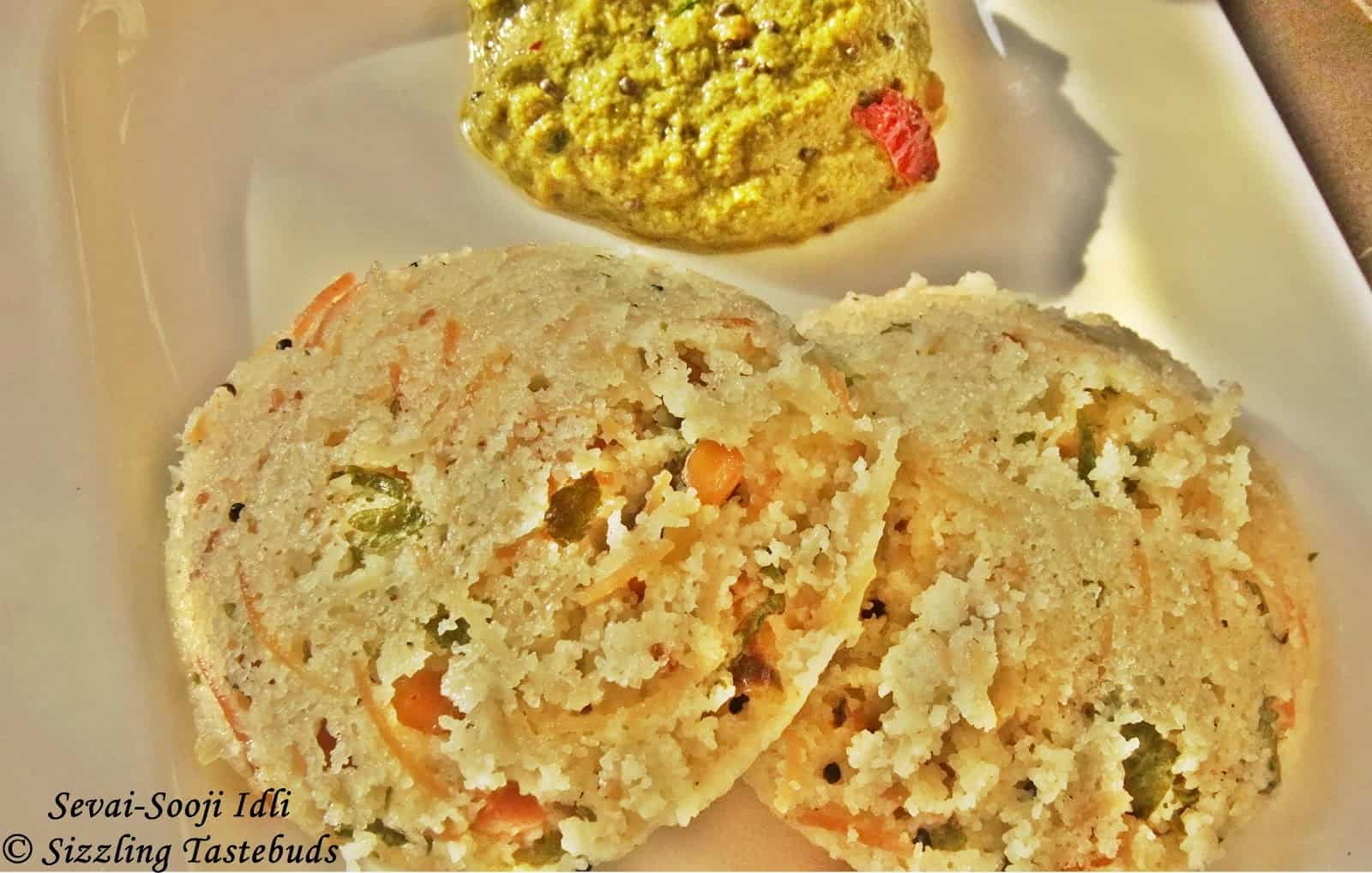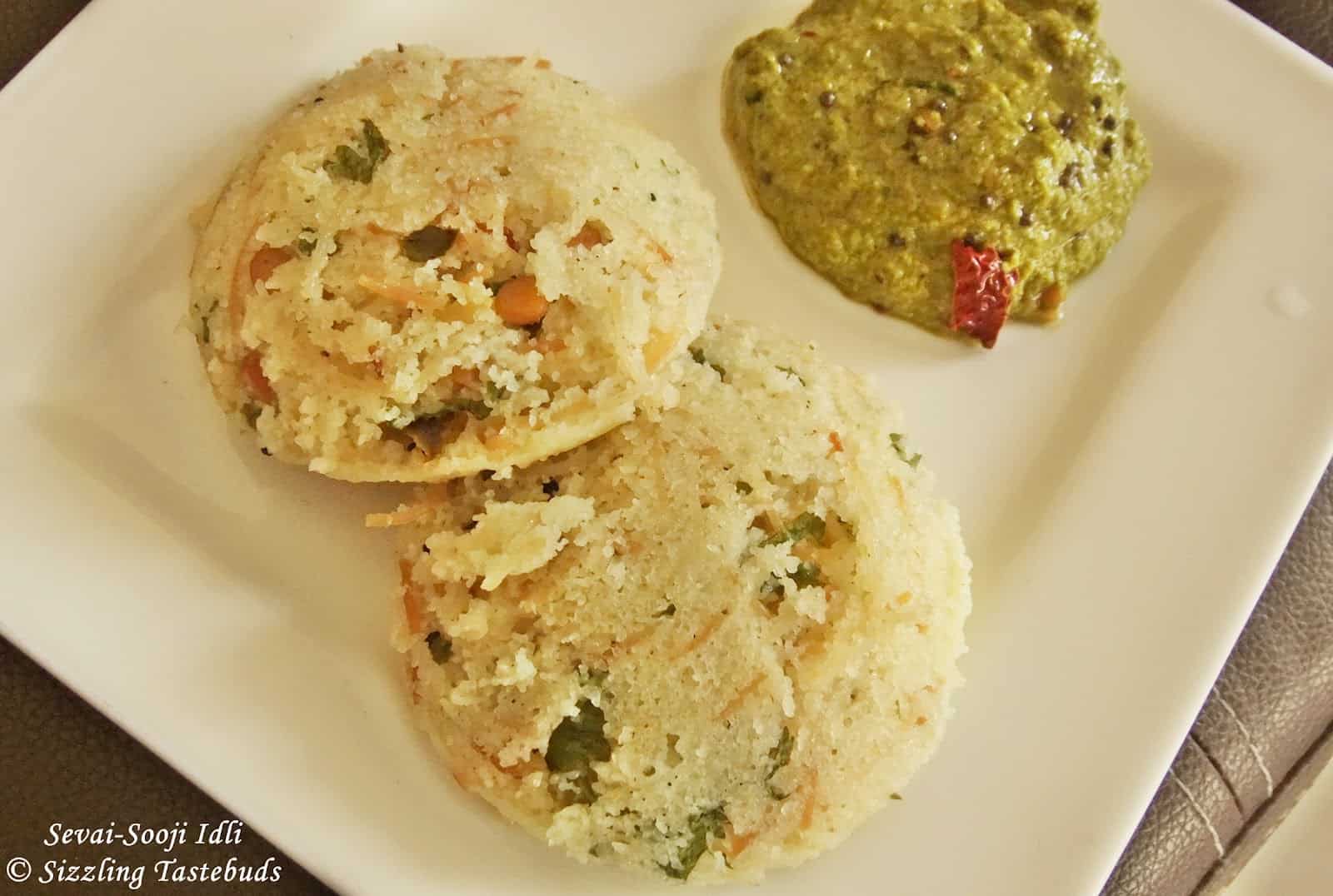Idlis are a saviour both in terms of time and health in my family. I do keep trying different varieties of these steamed delicacies, and today’s dish was more an experiment that everyone loved ! Sevai-Rava Idly, or Vermicilli- Semolina Idli accompanied by Tangy Coriander Chutney made a complete meal by itself. And what’s more, it added a variety of Idly after Toor Dal Idly, Mini Carrot Idly, Pepper Idli, Poha Idli etc. Makes for a filling breakfast as well as a healthy lunchbox option.