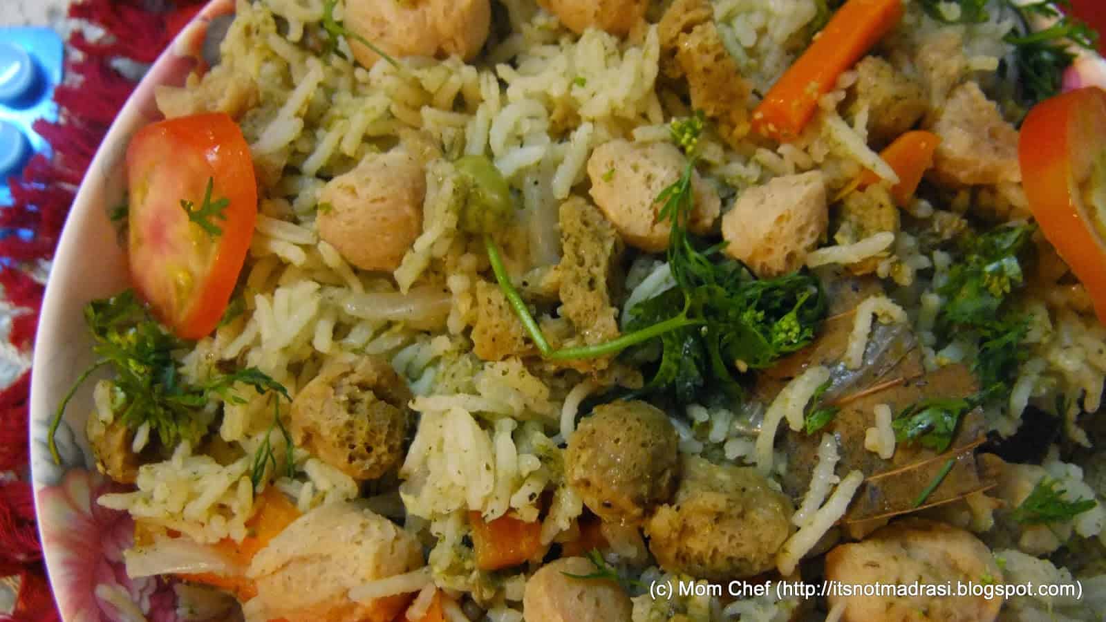 Mushrooms, Soya, Olive Oil entered Indian cuisine as a health / social fad, as much as making Manchurian at home was fashionable. Promoted heavily by health-proponents, Soya in various forms(flour/chunks/shreds) made its way into my kitchen not so long ago. It looked vegetarian (which my kitchen is), but tasted quite 'differently' for my brahminical upbringing. However, Google and its many cousins helped me find ways to use this cholestrol-reducing ingredient in my everyday cuisine. And one that has hit off very well with mine and S's eating preferences is Soya Veg Pulav. A powerhouse of goodness, this dish packs in the protein requirement for the day with the mint-coriander masala lending a wonderful flavour. Its a wonderful option for kids' lunchboxes too 🙂