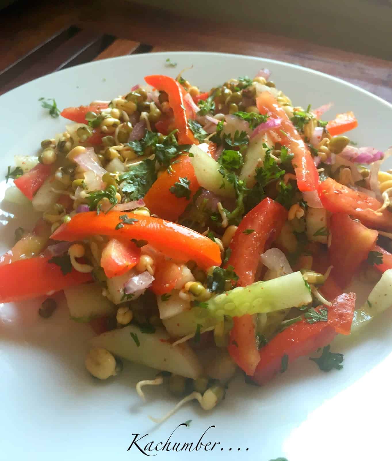 The moong sprouts lend the nutrition factor while that spicy dressing adds a punch to the kachumber.