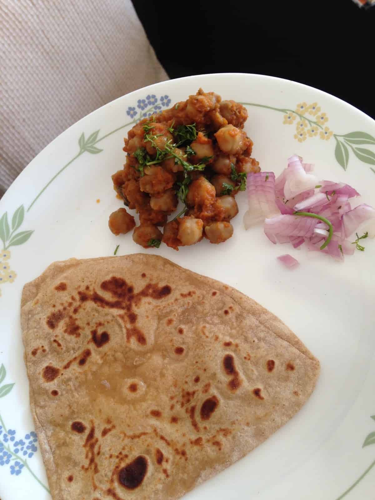 So, presenting sweet n spicy (ghee-stuffed) chapati that goes great for even (cold) lunchboxes on its own or with a spicy curry. I served it with Punjabi Chole.