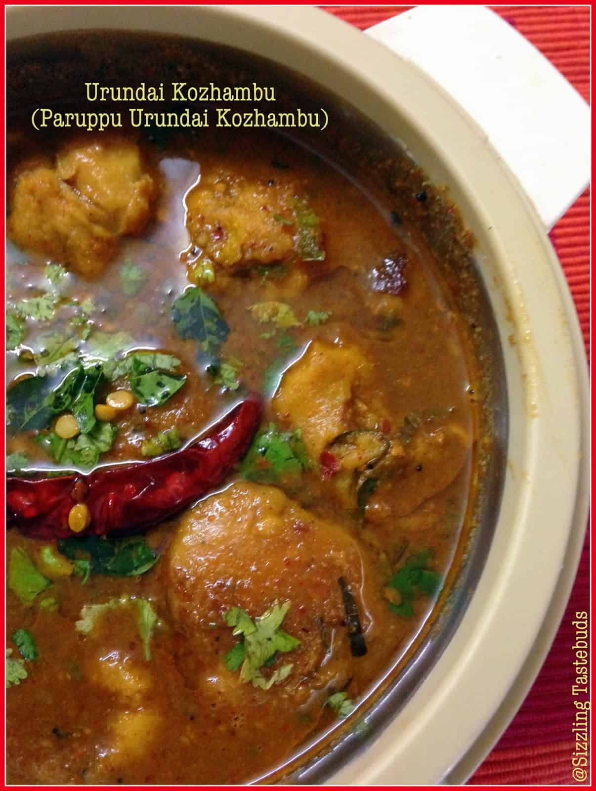 Paruppu Urundai Kuzhambu - Steamed spicy Lentil dumplings in spicy tangy tamarind sauce