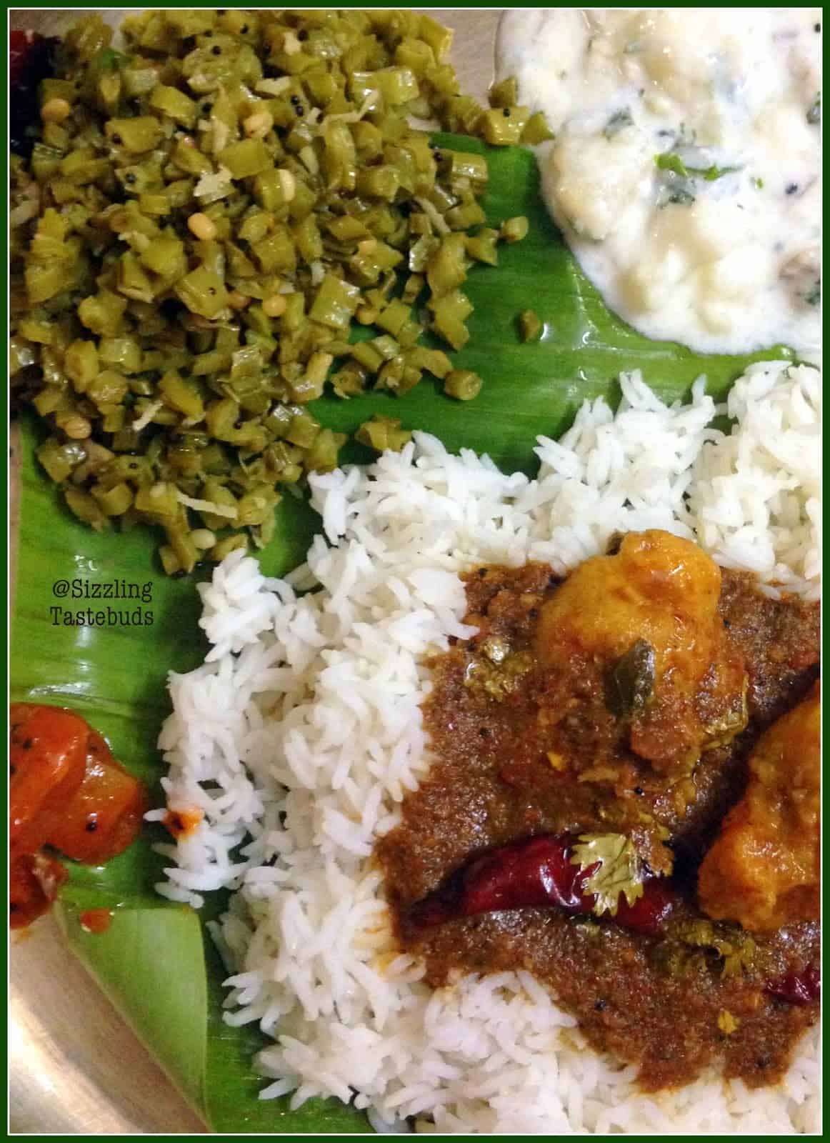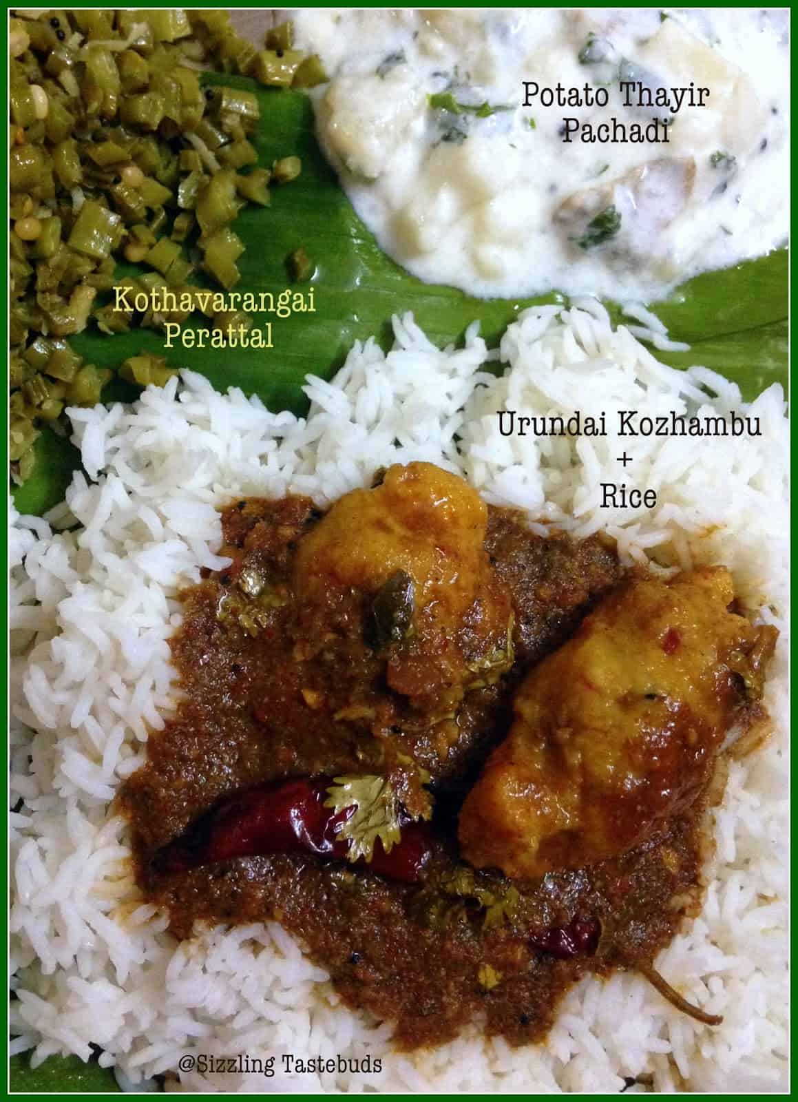 Served here with Cluster beans stir fry (kothavarangai poriyal) , steamed rice, Potato raita (Urulaikizhangu Thayir Pachadi), Quick Amla pickle.