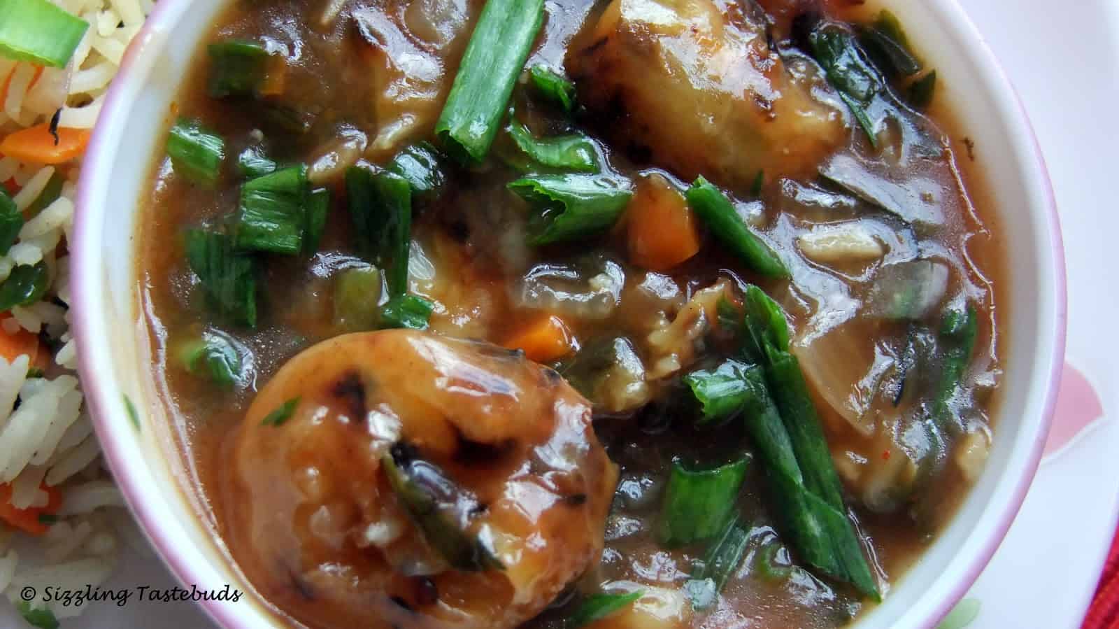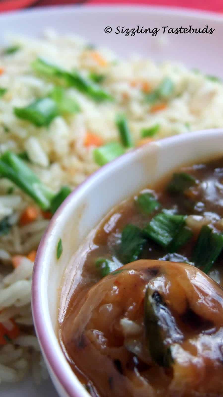3. Jut before serving, add the pan fried Manchurian into the simmering gravy. Let is soak for further 4-8 mins to absorb the gravy spice.Top with chopped spring onions and serve with Veg Fried rice.